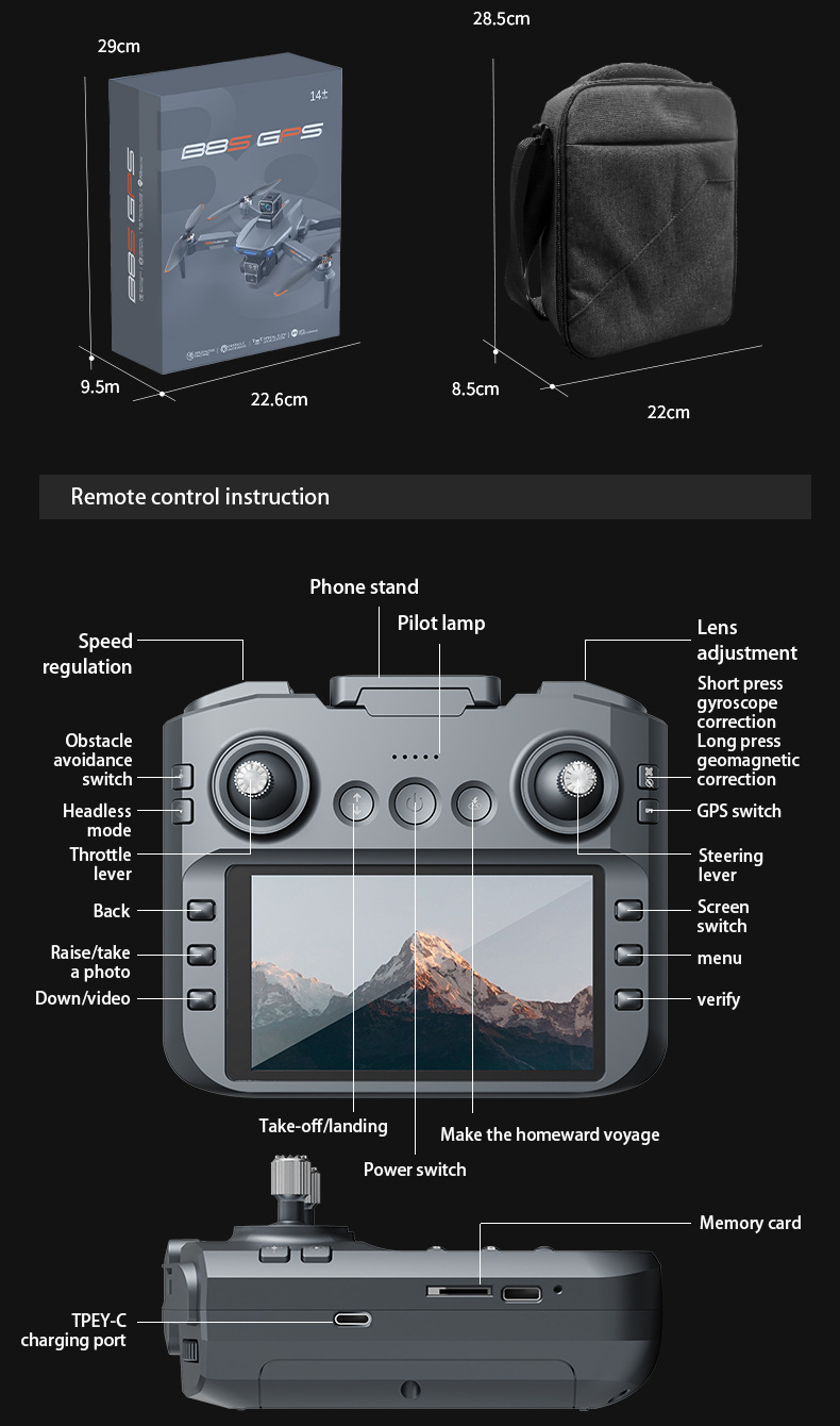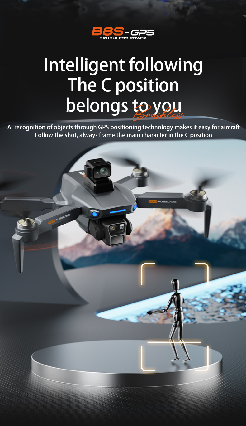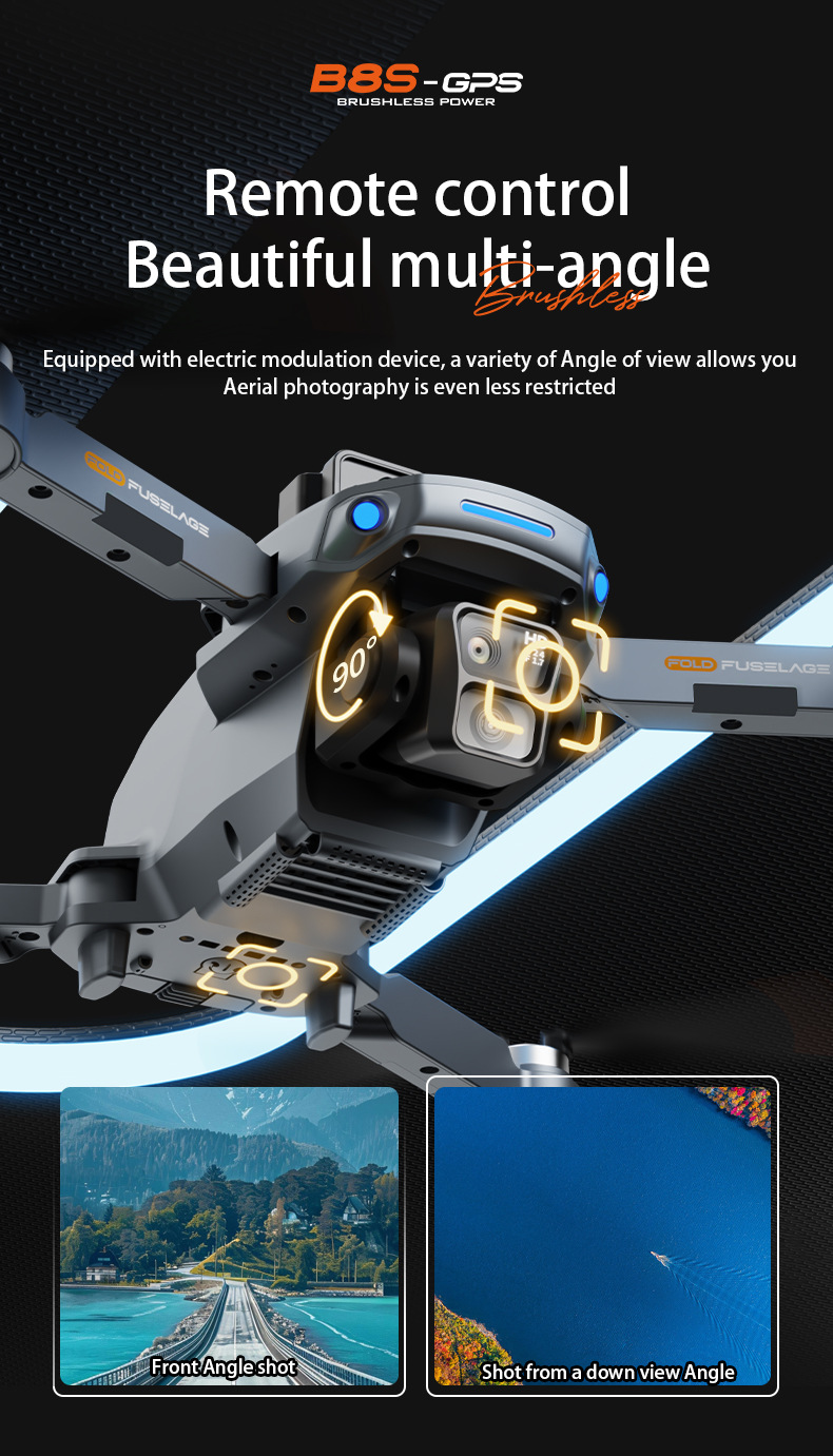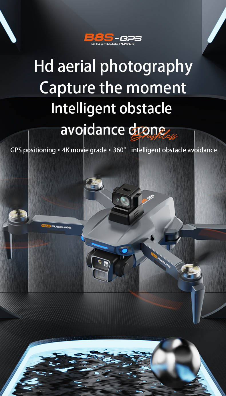 Model: B8S Description: GPS obstacle avoidance aerial photography drone with 4.5 inch screen Body weight: (UAV body + battery) 252g Product color: silver gray Material: Plastic metal electronic components Receiving frequency: 2.4G Number of channels: 4 channels 6 axis gyroscope Age: 14+ Appearance: Folding drone Battery: 3.7V 2000Mah Charging time: about 180 minutes Charging method: USB cable charging Single battery flight time: about 20 minutes Remote control screen: 4.5-inch screen photo transmission Motor model: 1504 brushless motor Remote control mode: left hand throttle right hand direction Fast/Slow: Fast/slow Remote control distance: 2km Image transmission distance: about 500 meters Remote control battery: 3.7V 350Mah The remote control lasts about 3 hours Remote control charging time: about 1 hour Resolution: HD 720P Lens Angle: electric steering gear adjustment 90° Image transmission signal: 5G WIFI transmission 2.4G optical flow brushless four sided obstacle avoidance folding drone with dual lens WIFI professional aerial camera, small size with servo pan and tilt, cool lighting Description: 4.5-inch LCD large color screen 1. GPS one click return to takeoff point, low power return, no signal return 2. ① GPS intelligent tracking; ② Image Follow: Identify the subject being photographed and perform automatic flight following 3. Gesture shooting recognition: Within 1-3m of the aircraft, make a camera gesture/video gesture facing the camera 4. Multi point route planning flight: The aircraft flies autonomously according to the pre-set route, and players focus on shooting 5. Fixed point surround: Find the center point of the surround and then move the desired surround radius with the joystick 6. Aircraft retrieval function: Click the GPS signal icon three times in a row to open the map interface, which displays the last distance, latitude and longitude position of the aircraft 7. Images can be shared with music and videos: single or multiple photos can be shared, while videos can only be shared individually at a time 8. 4K adjustable camera (laser obstacle avoidance) 9. 3.7V plug-in intelligent lithium battery 4K:Video resolution(Front camera) 1920*1080P Photo resolution(Front camera) 3840*2160P Package Included: Drone * 1 4.5-inch remote control with screen * 1 3.7V 2000Mah Battery * 1 Obstacle Avoidance Device* 1 USB Cable * 1 Fan blade * 8 Screwdriver * 1 Spare screw * 4 Manual * 1 APP manual * 1 Backpack * 1