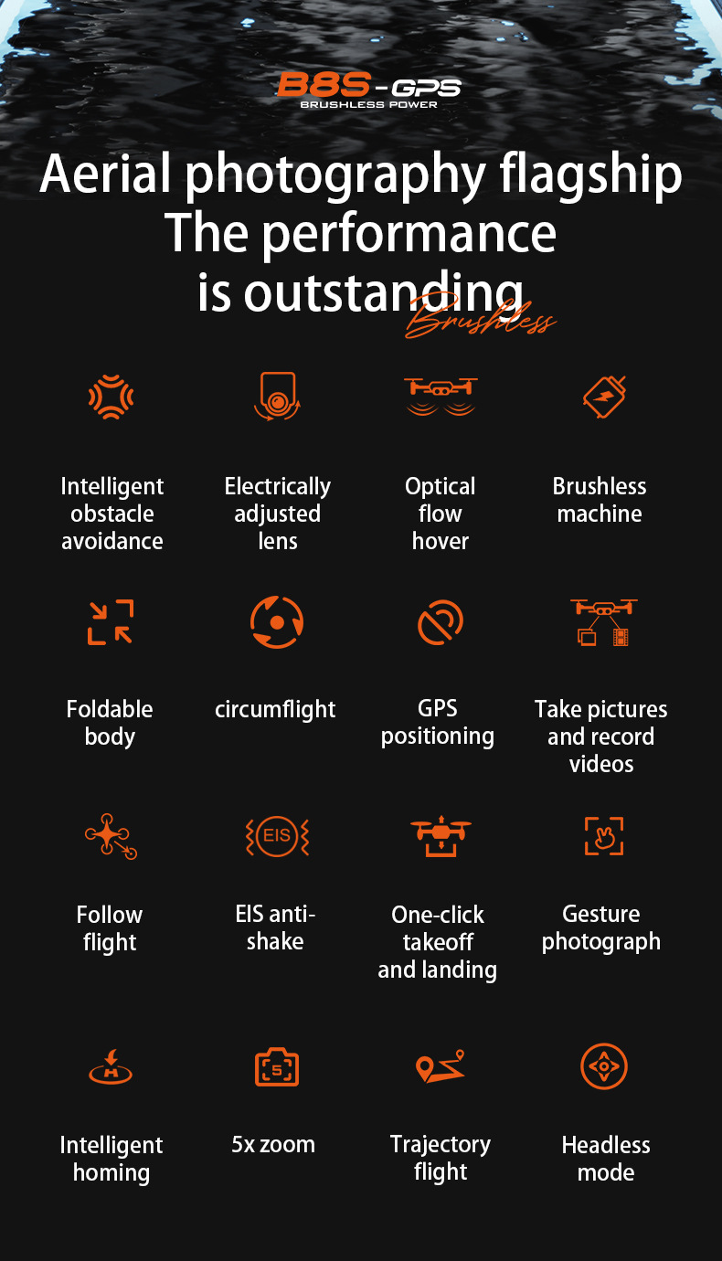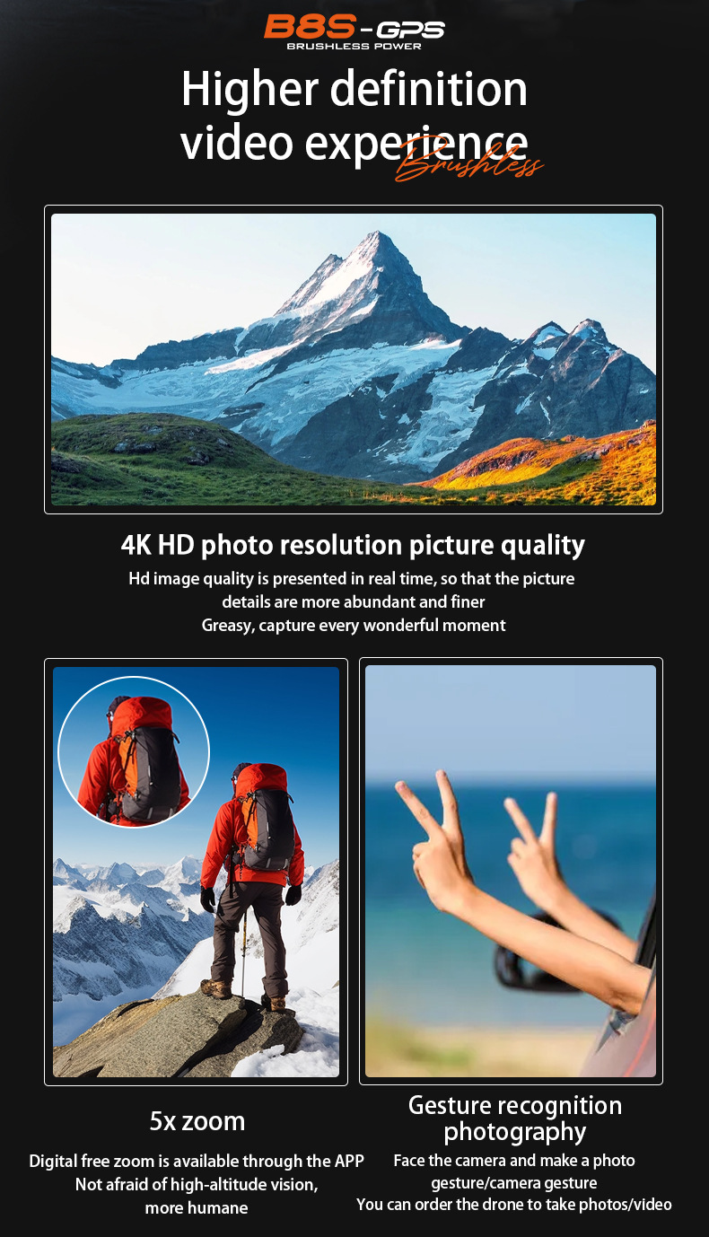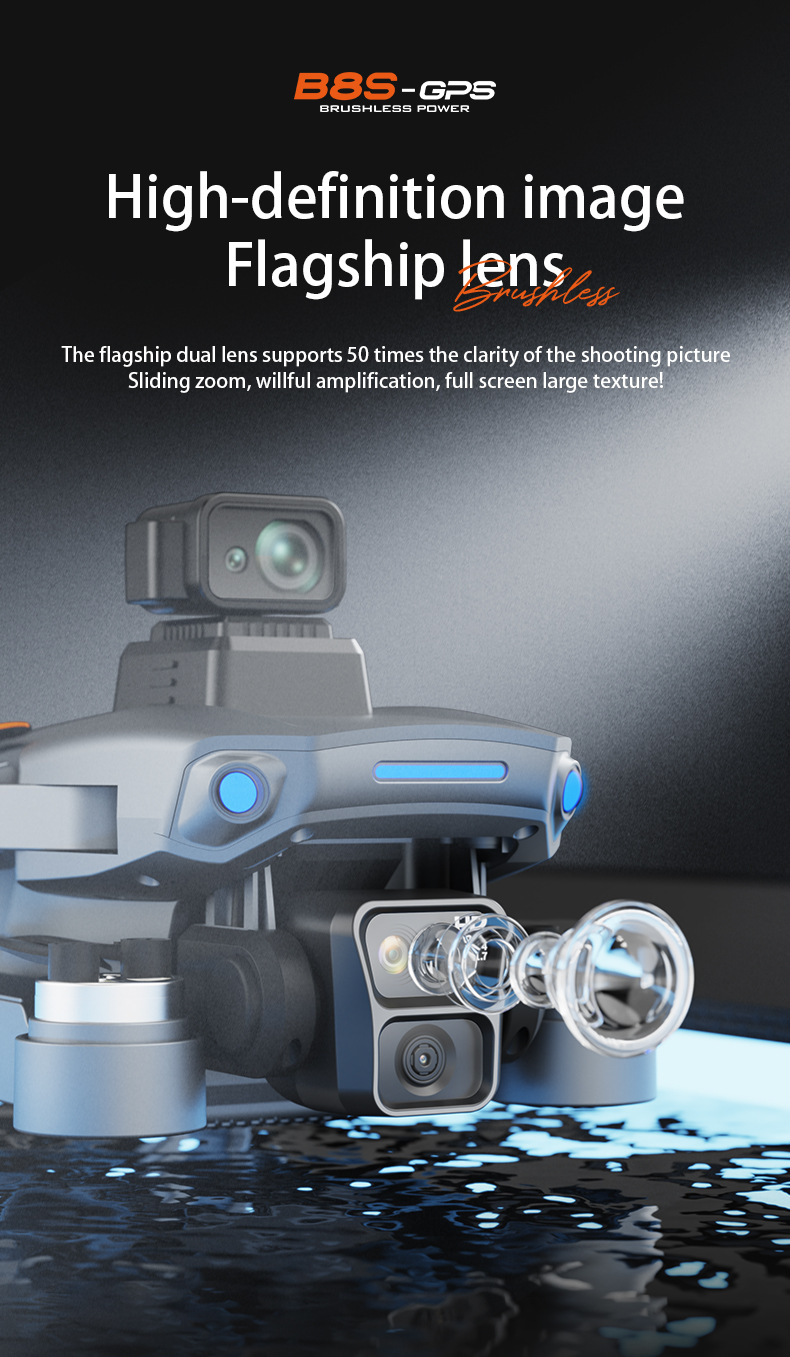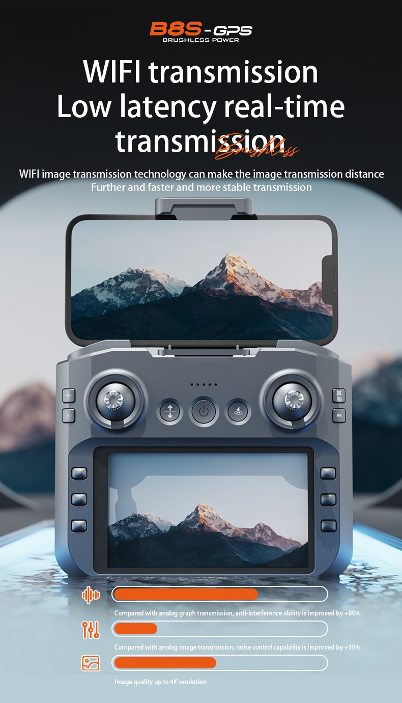 Model: B8S Description: GPS obstacle avoidance aerial photography drone with 4.5 inch screen Body weight: (UAV body + battery) 252g Product color: silver gray Material: Plastic metal electronic components Receiving frequency: 2.4G Number of channels: 4 channels 6 axis gyroscope Age: 14+ Appearance: Folding drone Battery: 3.7V 2000Mah Charging time: about 180 minutes Charging method: USB cable charging Single battery flight time: about 20 minutes Remote control screen: 4.5-inch screen photo transmission Motor model: 1504 brushless motor Remote control mode: left hand throttle right hand direction Fast/Slow: Fast/slow Remote control distance: 2km Image transmission distance: about 500 meters Remote control battery: 3.7V 350Mah The remote control lasts about 3 hours Remote control charging time: about 1 hour Resolution: HD 720P Lens Angle: electric steering gear adjustment 90° Image transmission signal: 5G WIFI transmission 2.4G optical flow brushless four sided obstacle avoidance folding drone with dual lens WIFI professional aerial camera, small size with servo pan and tilt, cool lighting Description: 4.5-inch LCD large color screen 1. GPS one click return to takeoff point, low power return, no signal return 2. ① GPS intelligent tracking; ② Image Follow: Identify the subject being photographed and perform automatic flight following 3. Gesture shooting recognition: Within 1-3m of the aircraft, make a camera gesture/video gesture facing the camera 4. Multi point route planning flight: The aircraft flies autonomously according to the pre-set route, and players focus on shooting 5. Fixed point surround: Find the center point of the surround and then move the desired surround radius with the joystick 6. Aircraft retrieval function: Click the GPS signal icon three times in a row to open the map interface, which displays the last distance, latitude and longitude position of the aircraft 7. Images can be shared with music and videos: single or multiple photos can be shared, while videos can only be shared individually at a time 8. 4K adjustable camera (laser obstacle avoidance) 9. 3.7V plug-in intelligent lithium battery 4K:Video resolution(Front camera) 1920*1080P Photo resolution(Front camera) 3840*2160P Package Included: Drone * 1 4.5-inch remote control with screen * 1 3.7V 2000Mah Battery * 1 Obstacle Avoidance Device* 1 USB Cable * 1 Fan blade * 8 Screwdriver * 1 Spare screw * 4 Manual * 1 APP manual * 1 Backpack * 1