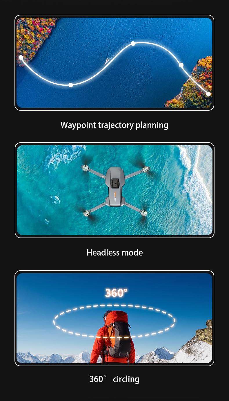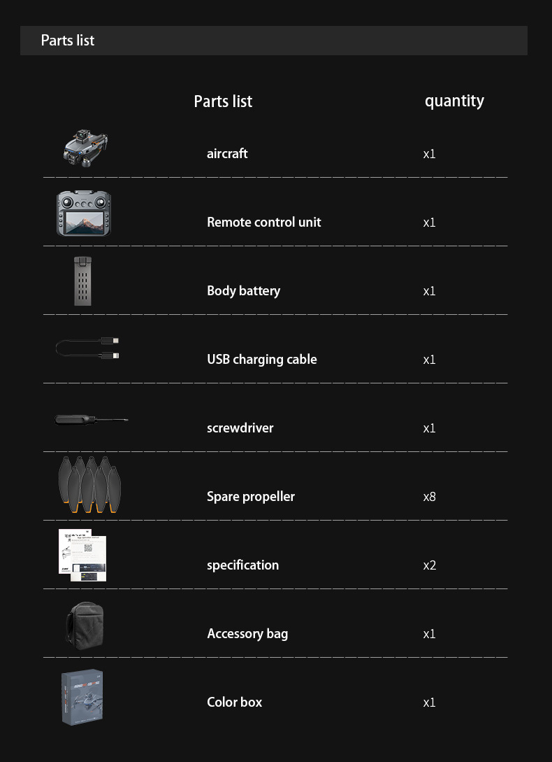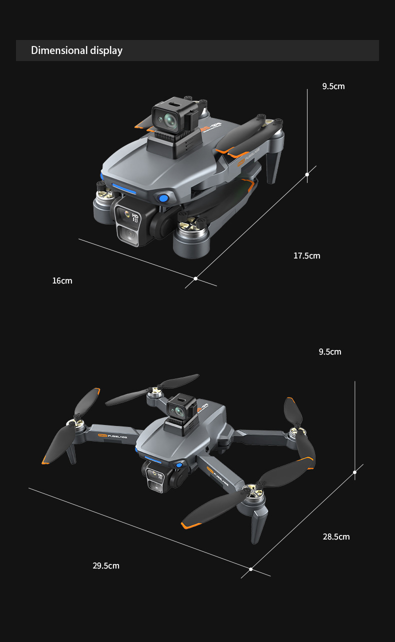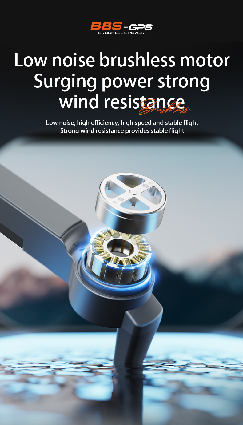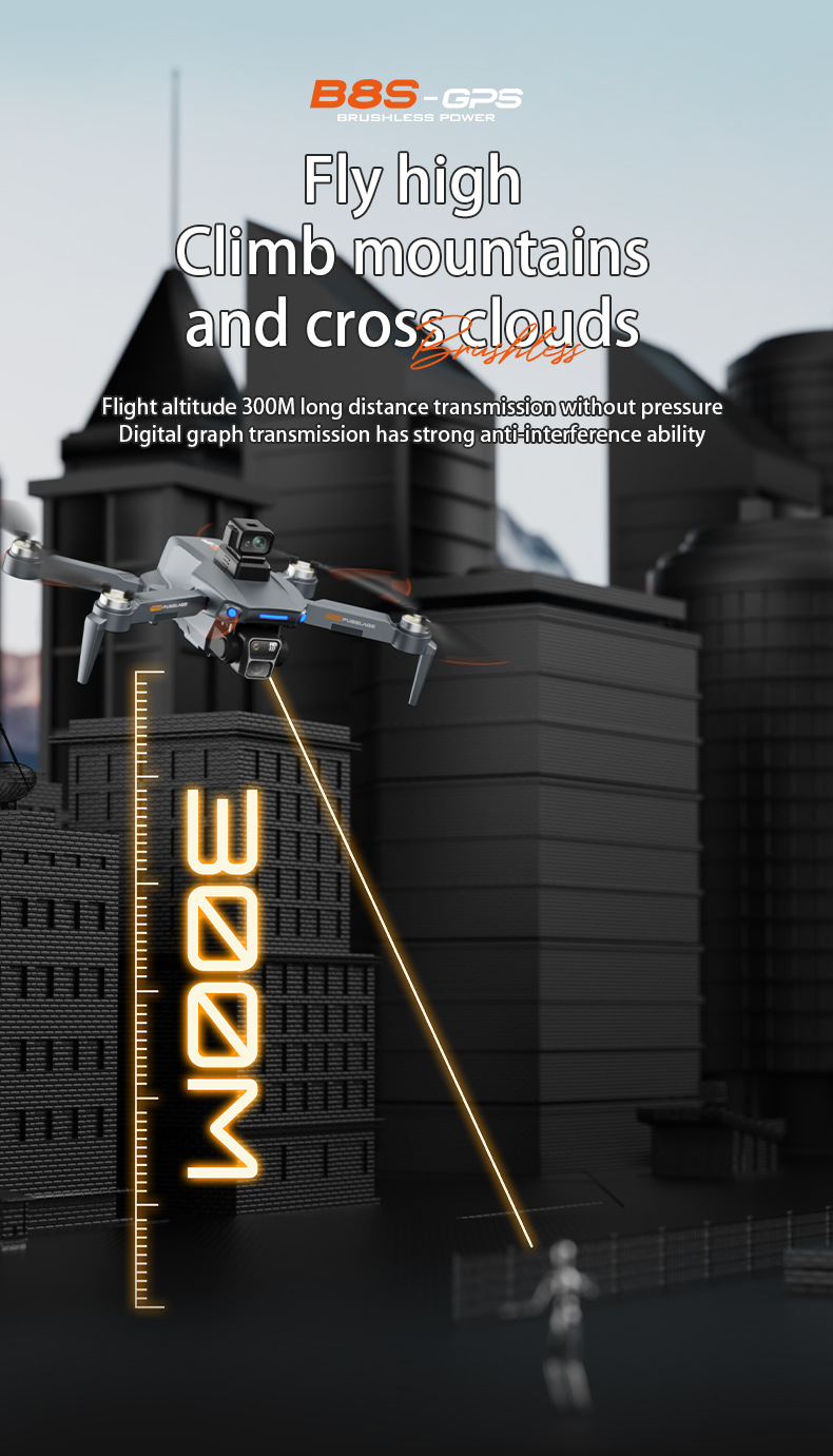 Model: B8S Description: GPS obstacle avoidance aerial photography drone with 4.5 inch screen Body weight: (UAV body + battery) 252g Product color: silver gray Material: Plastic metal electronic components Receiving frequency: 2.4G Number of channels: 4 channels 6 axis gyroscope Age: 14+ Appearance: Folding drone Battery: 3.7V 2000Mah Charging time: about 180 minutes Charging method: USB cable charging Single battery flight time: about 20 minutes Remote control screen: 4.5-inch screen photo transmission Motor model: 1504 brushless motor Remote control mode: left hand throttle right hand direction Fast/Slow: Fast/slow Remote control distance: 2km Image transmission distance: about 500 meters Remote control battery: 3.7V 350Mah The remote control lasts about 3 hours Remote control charging time: about 1 hour Resolution: HD 720P Lens Angle: electric steering gear adjustment 90° Image transmission signal: 5G WIFI transmission 2.4G optical flow brushless four sided obstacle avoidance folding drone with dual lens WIFI professional aerial camera, small size with servo pan and tilt, cool lighting Description: 4.5-inch LCD large color screen 1. GPS one click return to takeoff point, low power return, no signal return 2. ① GPS intelligent tracking; ② Image Follow: Identify the subject being photographed and perform automatic flight following 3. Gesture shooting recognition: Within 1-3m of the aircraft, make a camera gesture/video gesture facing the camera 4. Multi point route planning flight: The aircraft flies autonomously according to the pre-set route, and players focus on shooting 5. Fixed point surround: Find the center point of the surround and then move the desired surround radius with the joystick 6. Aircraft retrieval function: Click the GPS signal icon three times in a row to open the map interface, which displays the last distance, latitude and longitude position of the aircraft 7. Images can be shared with music and videos: single or multiple photos can be shared, while videos can only be shared individually at a time 8. 4K adjustable camera (laser obstacle avoidance) 9. 3.7V plug-in intelligent lithium battery 4K:Video resolution(Front camera) 1920*1080P Photo resolution(Front camera) 3840*2160P Package Included: Drone * 1 4.5-inch remote control with screen * 1 3.7V 2000Mah Battery * 1 Obstacle Avoidance Device* 1 USB Cable * 1 Fan blade * 8 Screwdriver * 1 Spare screw * 4 Manual * 1 APP manual * 1 Backpack * 1