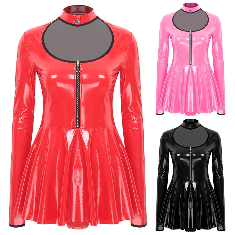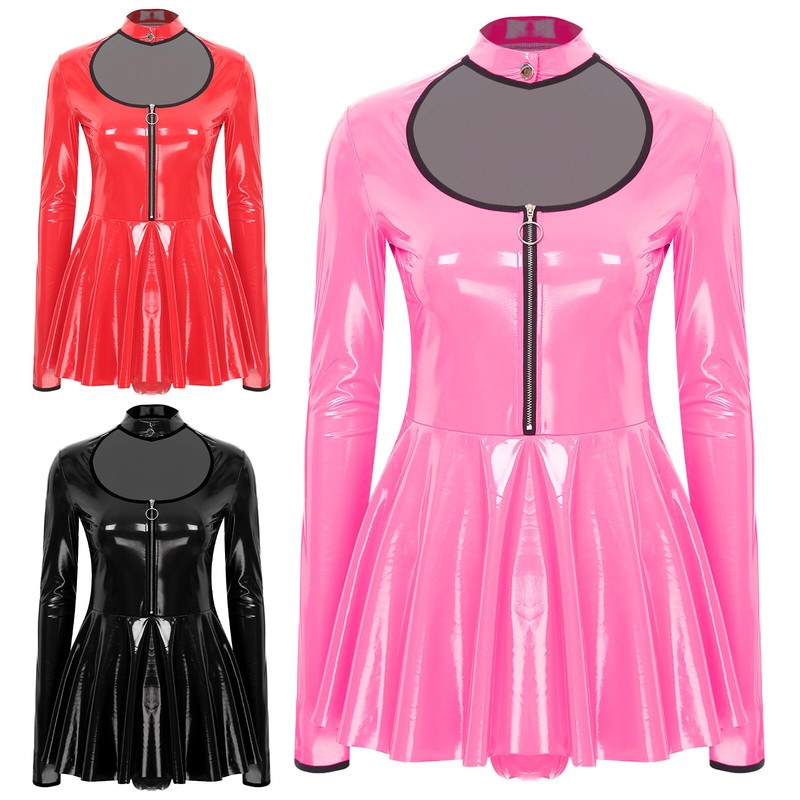 A lingerie for women, designed with mock neck, long sleeve, cut out at chest, a-line dress with built-in underwear and front zipper closure.