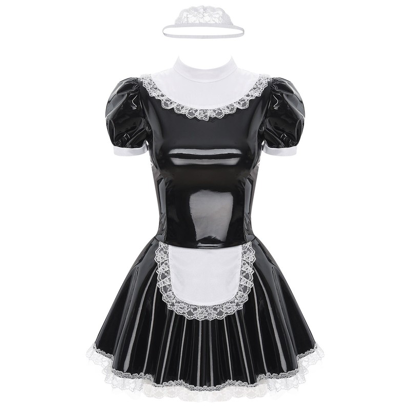 Women’s maid dress-up dress adopts satin and patent leather patchwork, integrated apron, short puff sleeve and back zipper closure.