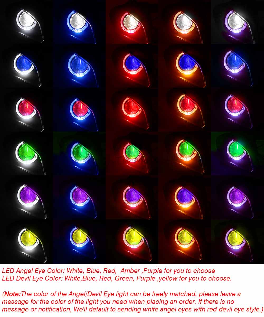 (Note:The color of the Angel/Devil Eye light can be freely matched, please leave a message for the color of the light you need when placing an order, or contact the customer service for notes. If there is no message or notification, We'll default to sending white angel eyes with red devil eye style.)