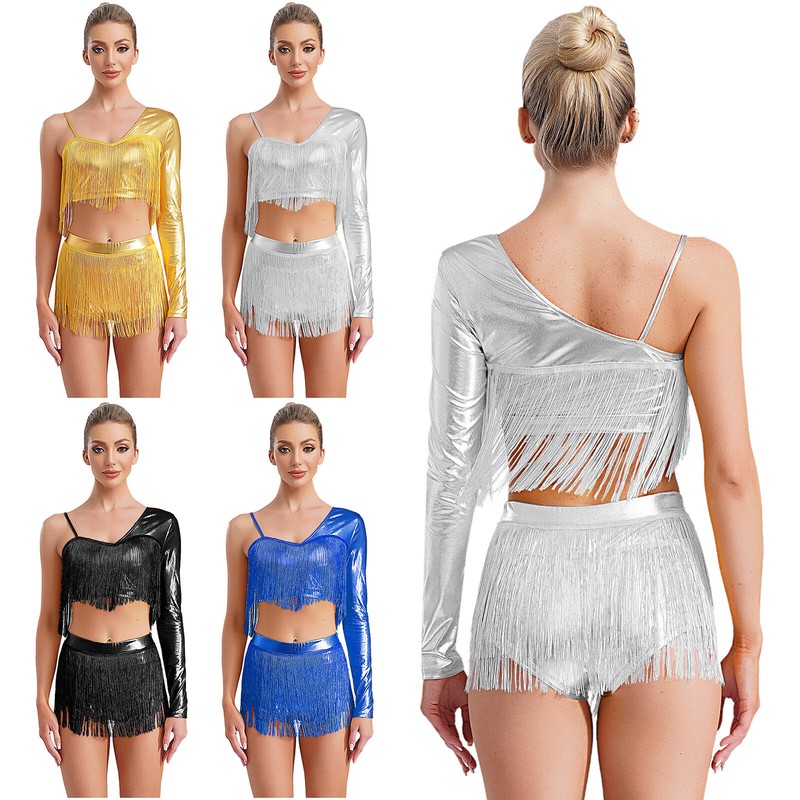 This dance outfit is adorned with tassels, metallic appearance set, adds a touch of glamour.