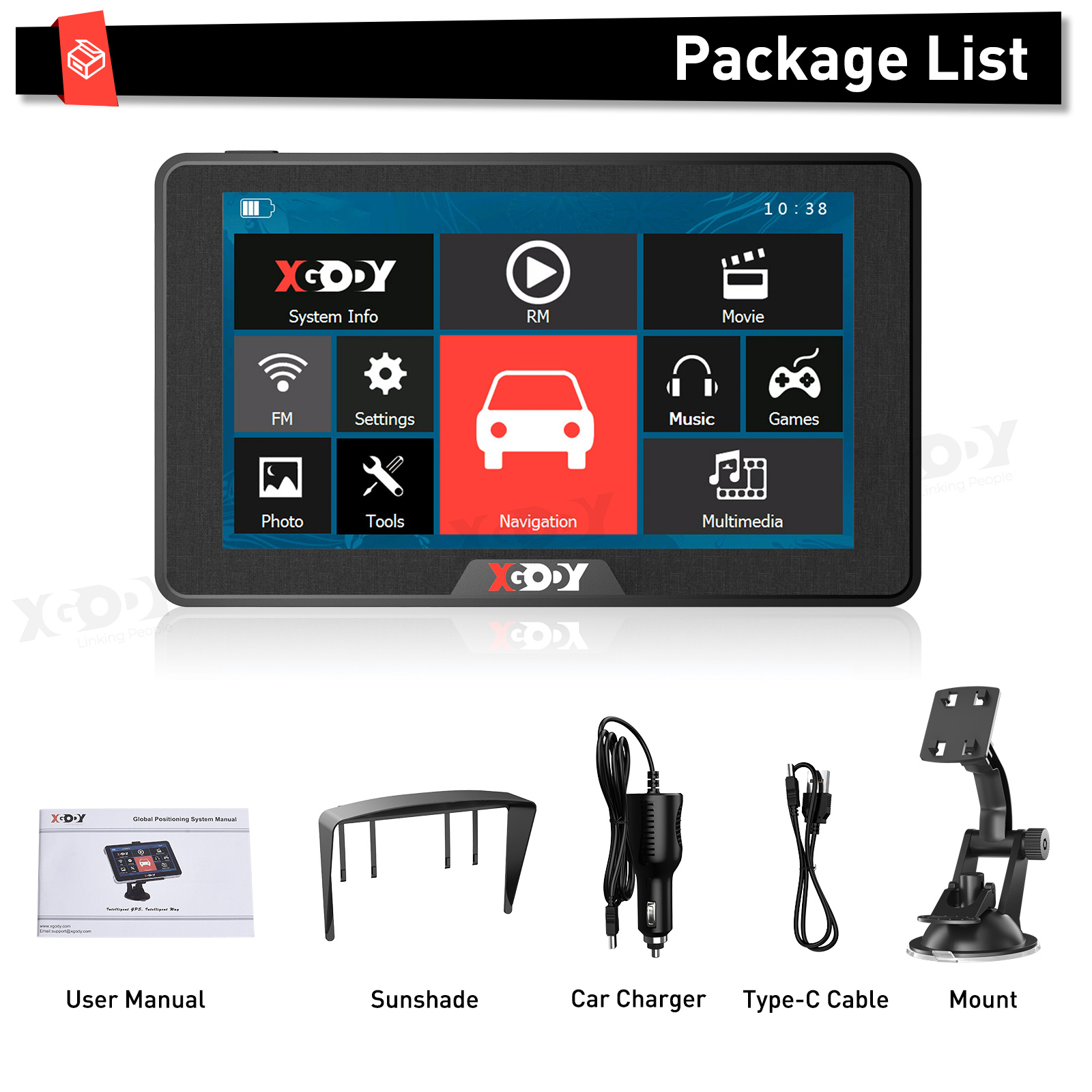 1* GPS NAVIGATION 1* TypeC-USB Cable 1* Suction Cup Mount 1* TypeC-USB Car Charger 1* Sunshade 1* User Manual |