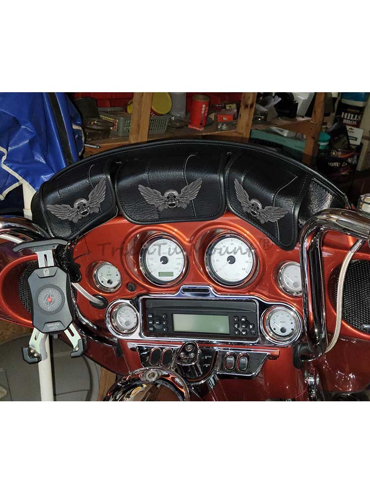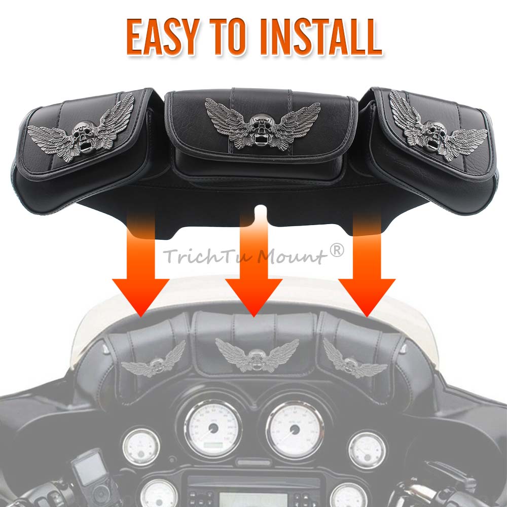 7.Purchased for Harley Touring Street Glide Electra Glide Windshield Bags 1996-2013, fit perfectly with no Modifications needed,and easy to install, no need to cut or drill.