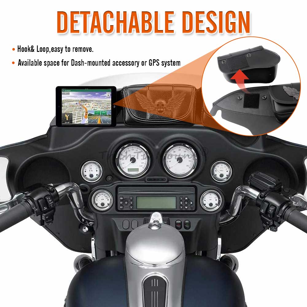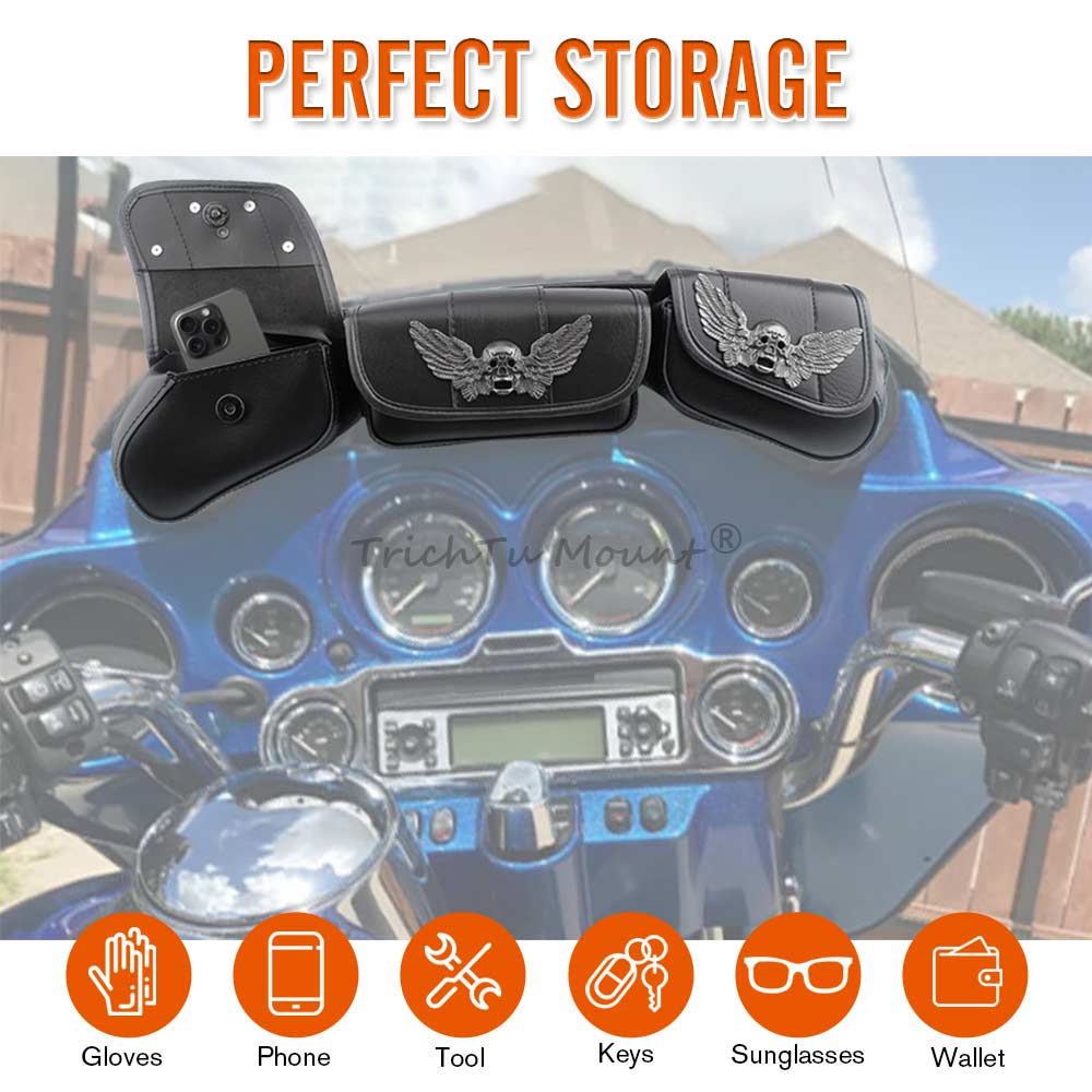 A Windshield bag features large opening flaps,Windshield bag saddle has three pouch pockets,that can provide a convenient place to store small items such as sunglasses, a wallet, or a phone, keys, gloves and so on. within easy reach while riding. This can help to keep your items organized and easily accessible.