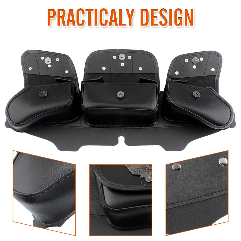 The perfect stitching process makes the three-pocket batwing fairing pouch more durable and will not be damaged or deformed due to poor seams.Reasonable pocket spacing allows three bags to be flipped at the same time without squeezing the space or easily squeezing and deforming.Soft interior of the bag won't scratch your tings.