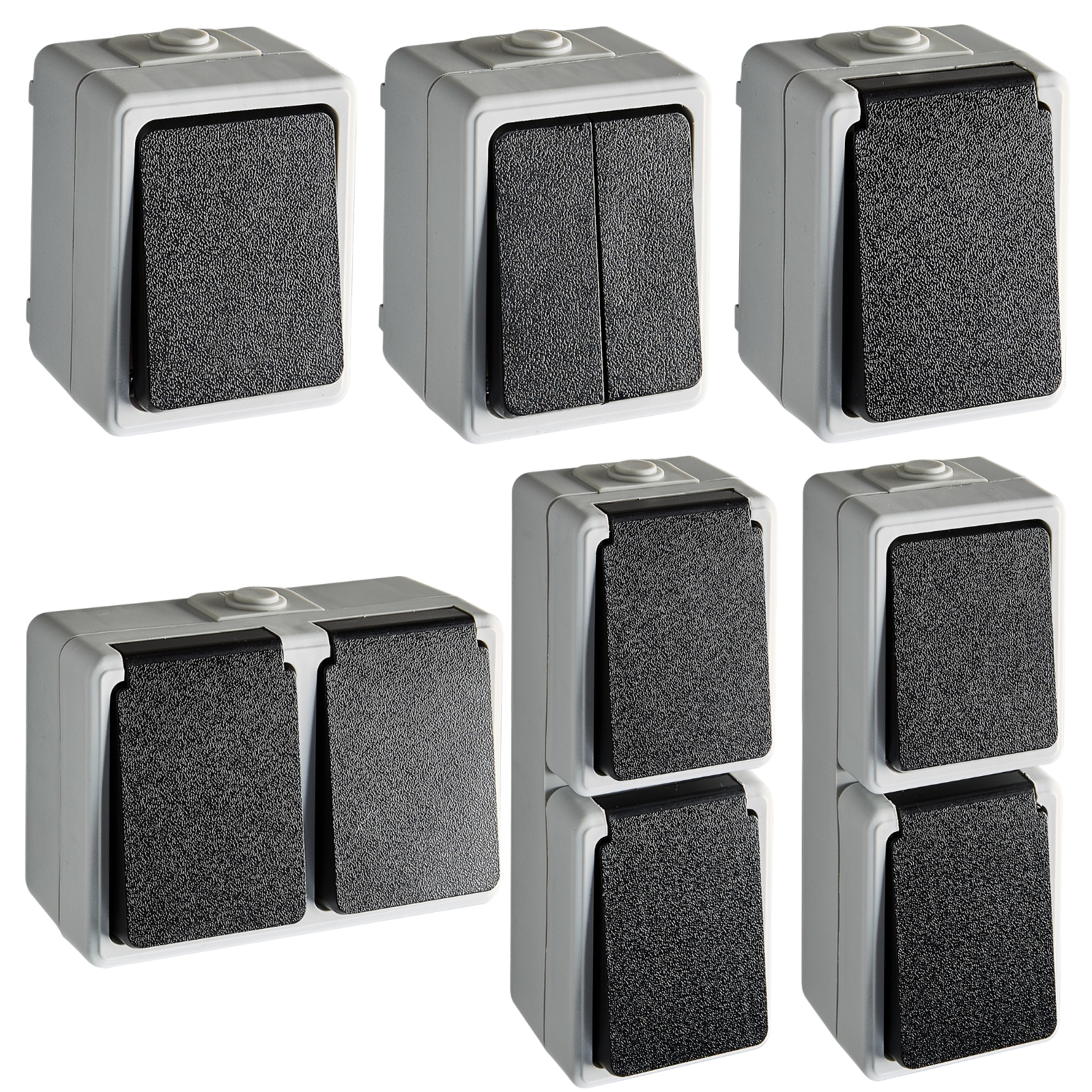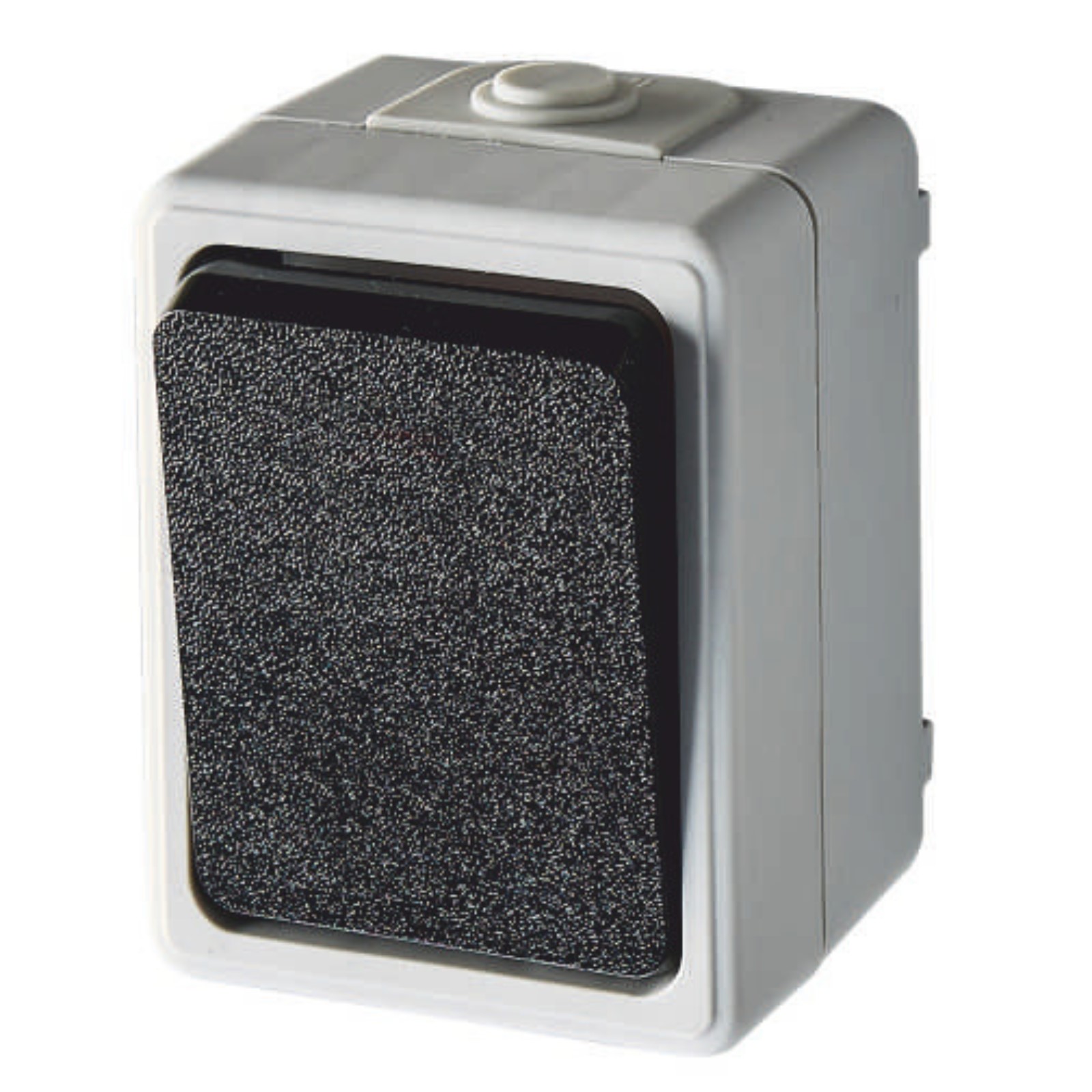 Aufputz-Feuchtraum Schalterserie MONSUN Aus-/Wechselschalter Steckdosenkombination mit Deckel Lichtgrau/Anthrazit IP44