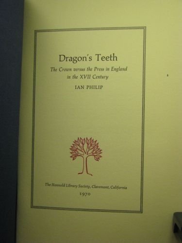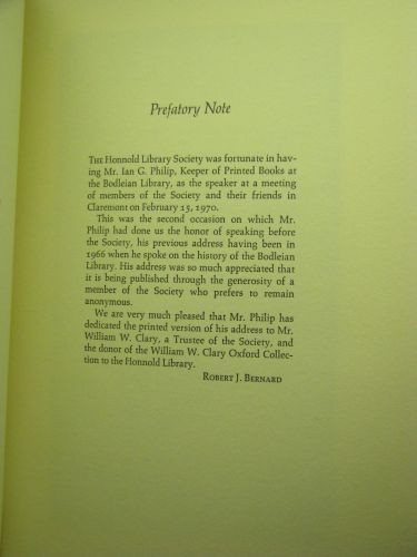 Description: A 23 page stapled booklet containing the presentation by Ian Philip to the Honnold Library Society of Claremont College, Claremont, California, February 15, 1970. Copies produced for distribution to members of the Roxburghe and Zamorano Clubs at their joint meeting September 26 and 27, 1970. Printed by Grant Dahlstrom.