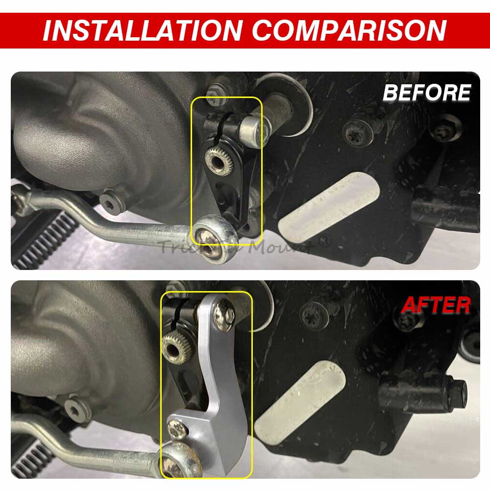 1. This small but effective component makes a big difference in yourriding experience.Offsetting the shift location changes the ratio, increases the stroke amount of the shift a little and reduces the weight of the shift, Makes shifting 30% easier. Therefore, please adjust the height of the shift peg in the shift linkage part and make sure the shift change is possible after the stay mounting.