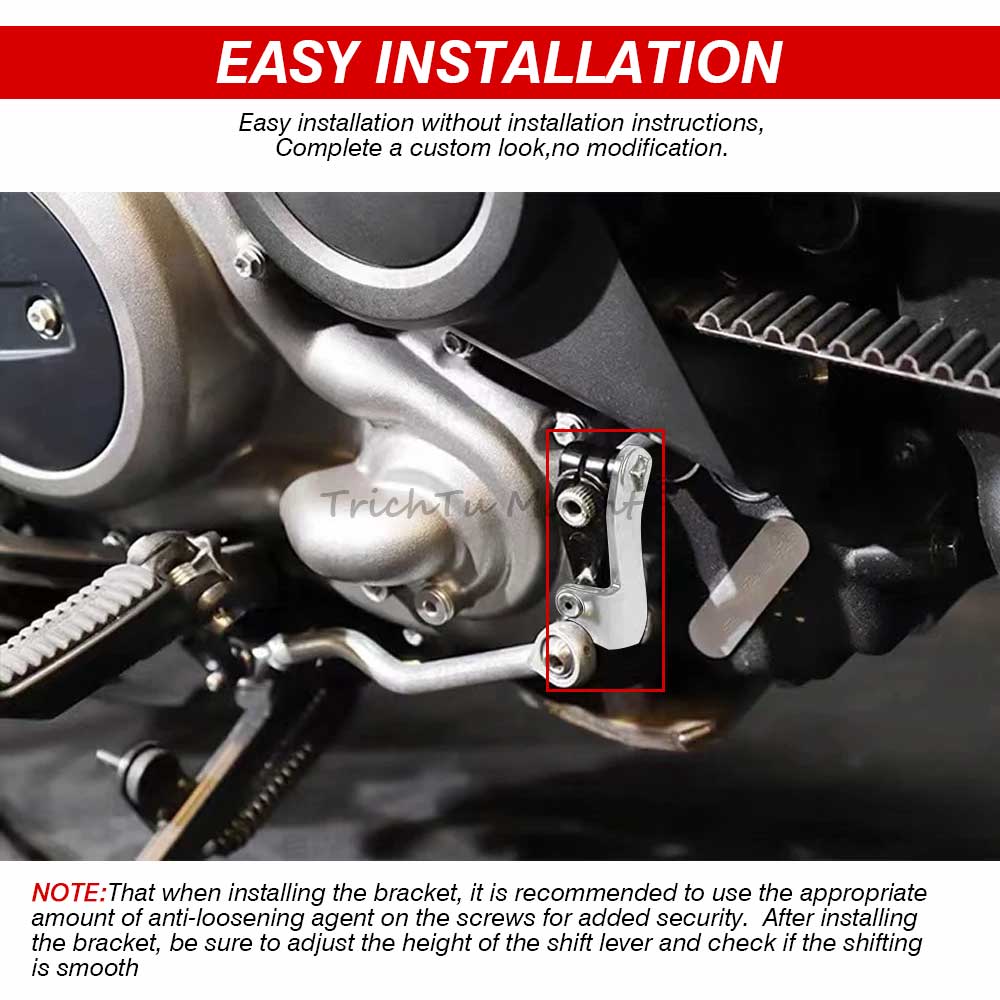 Please note that when installing the bracket, it is recommended to use the appropriate amount of anti-loosening agent on the screws for added security. After installing the bracket, be sure to adjust the height of the shift lever and check if the shifting is smooth