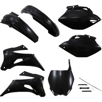 BlackStandard Kit includes Performance front fender, Stadium front number plate, Powerflow radiator shrouds, side panels and Powerflow rear fender. Powerflow Vented Kit includes Cycralite front fender, Powerflow rear fender, Stadium number plate and installation hardware, Powerflow intake radiator shrouds and side panels.