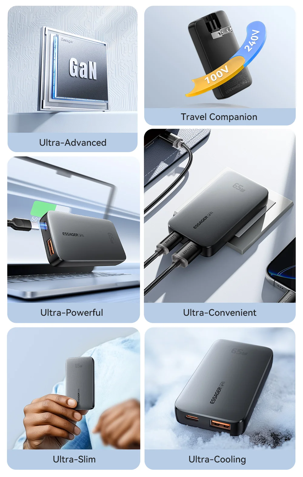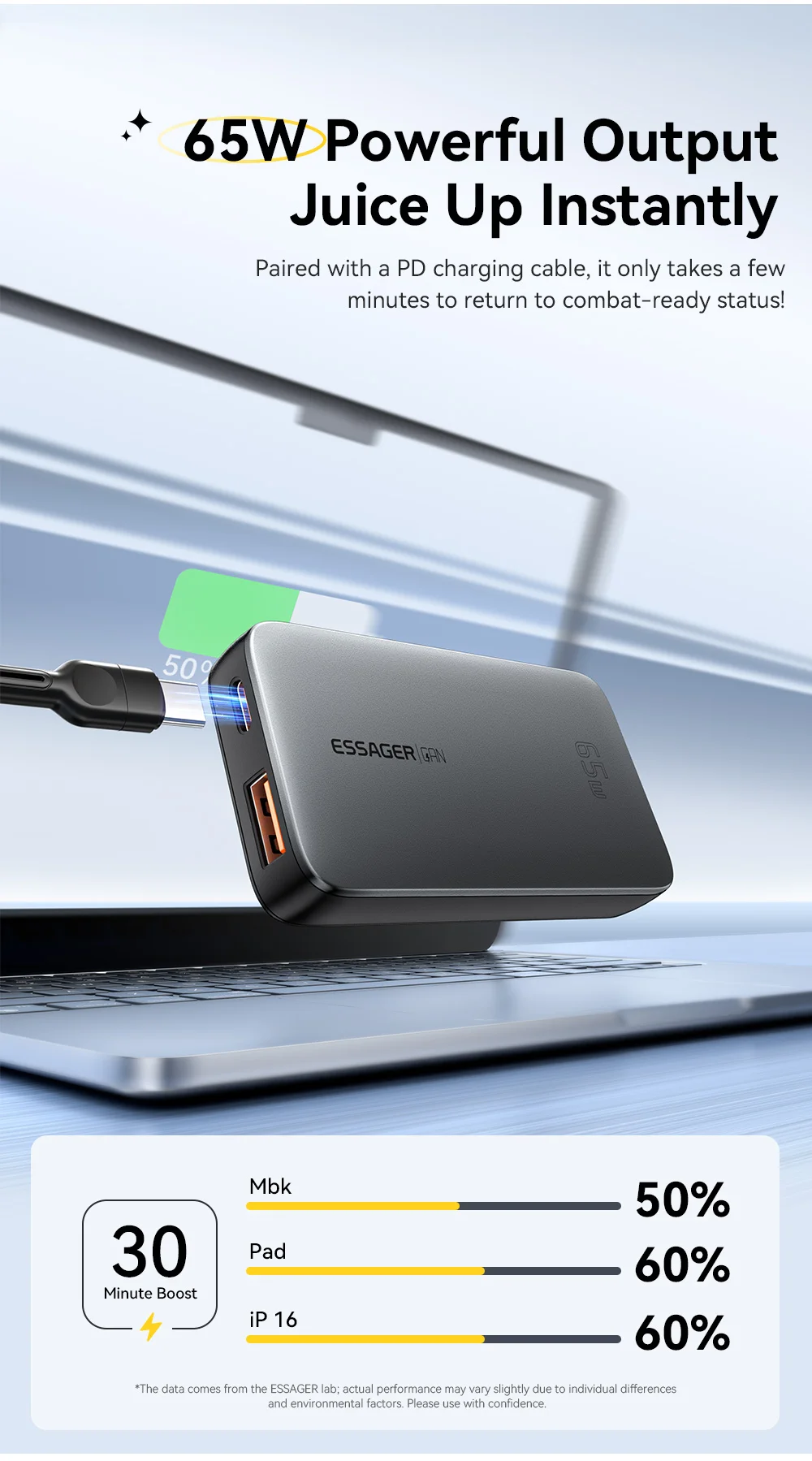 Essager 65W GaN Charger USB Type C PD3.0 Fast Charge + Quick Charge QC4.0 3.0: