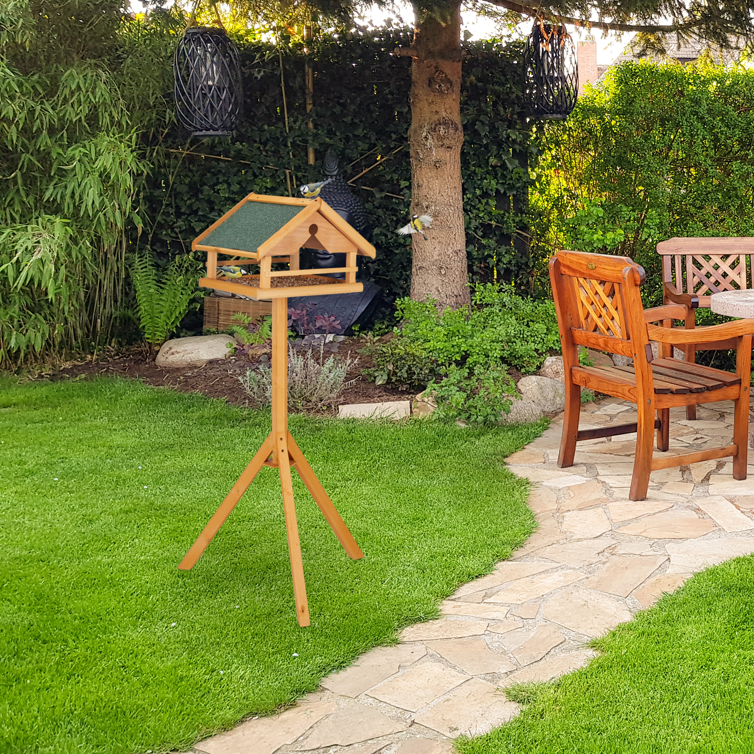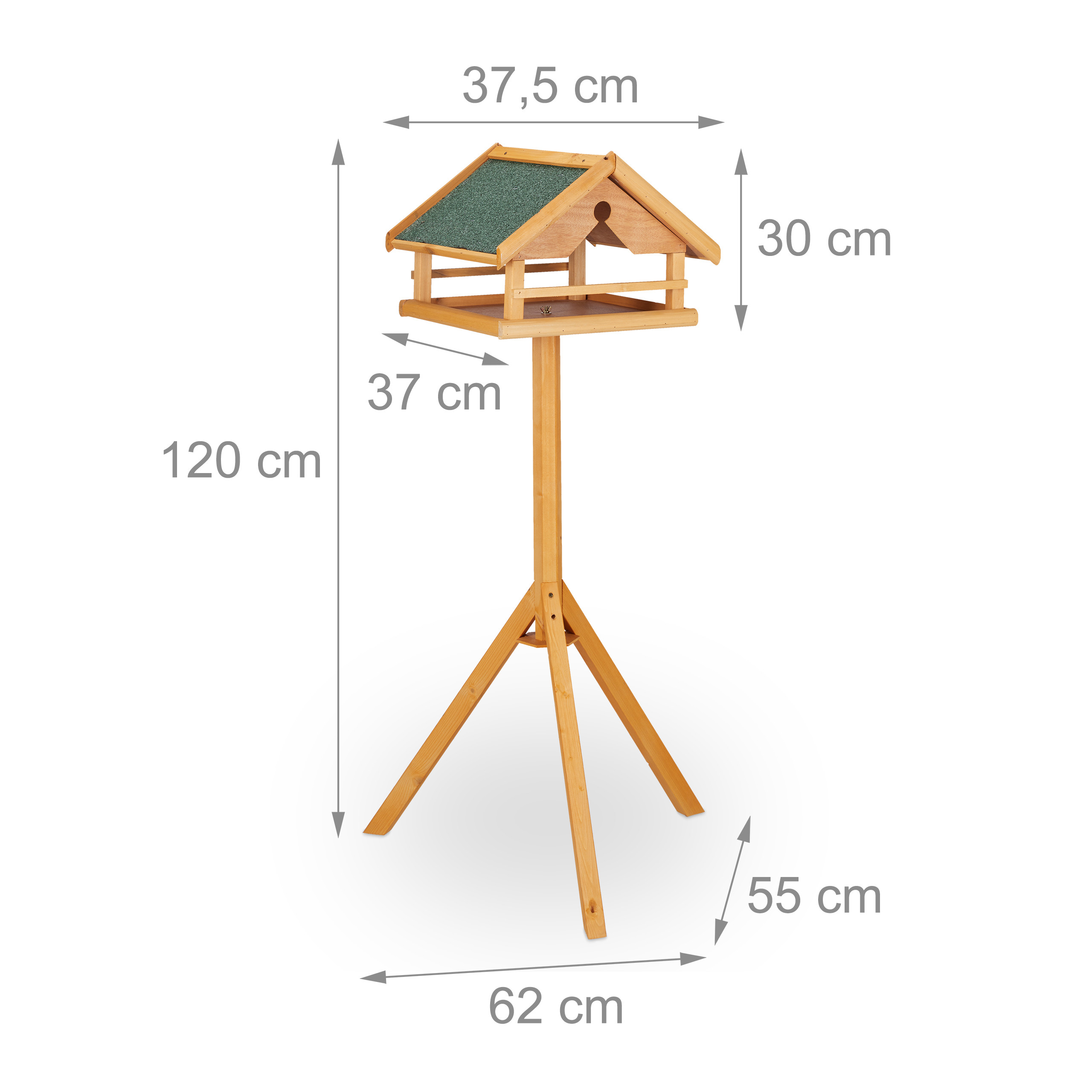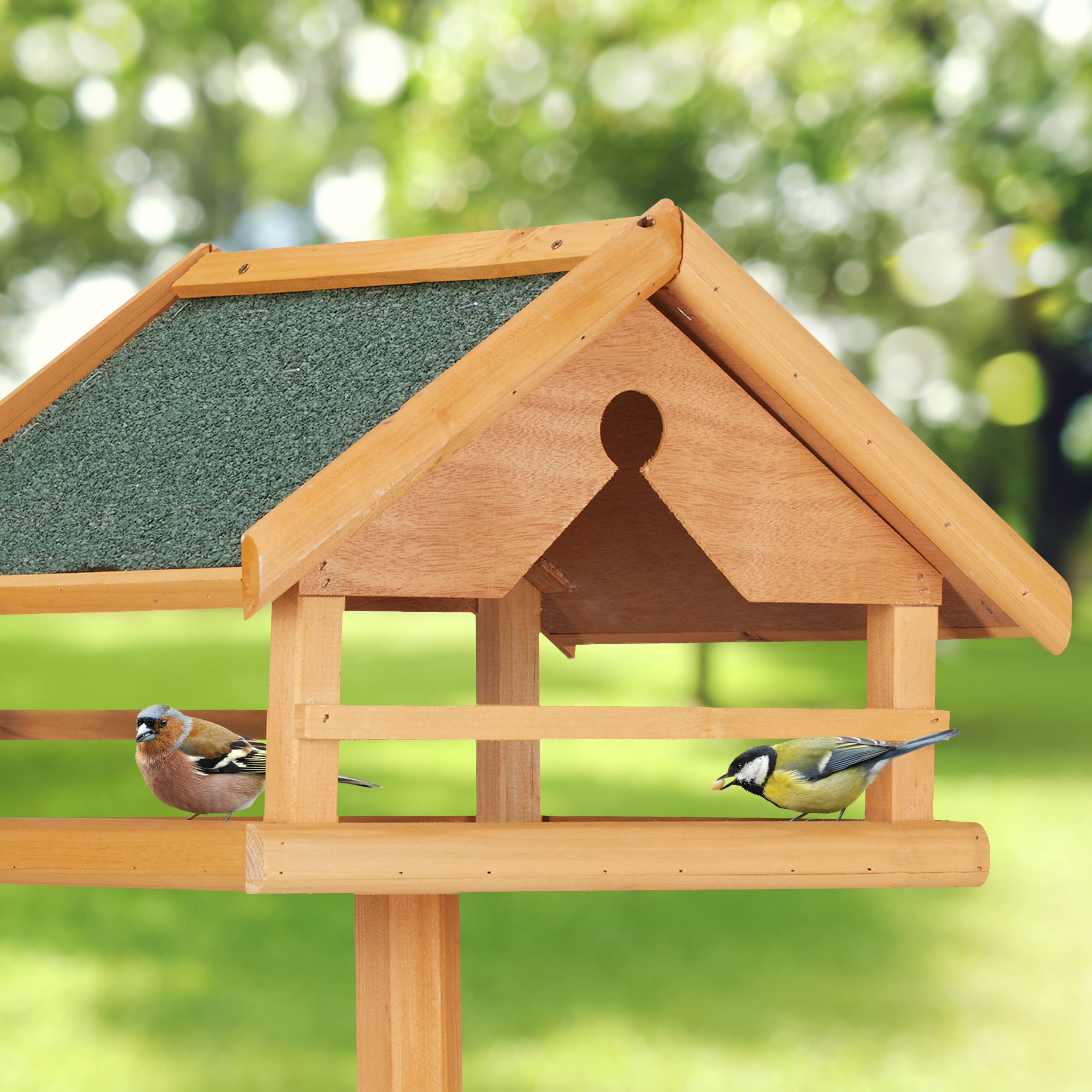 Das Futterhäuschen aus natürlichem Tannenholz kann auf Terrasse oder im Garten dank seines Standfußes ganz einfach aufgestellt werden. Füllen Sie ganzjährig Vogelfutter in die Futterstelle und locken Sie damit heimische Vögel wie Meisen, Amseln und Rotkehlchen an. Die Vogelfutterstation ist eine tolle Beobachtungsmöglichkeit - besonders für Kinder. Das Design des Vogelhauses mit grünem Dach fügt sich dabei harmonisch in die Natur ein.