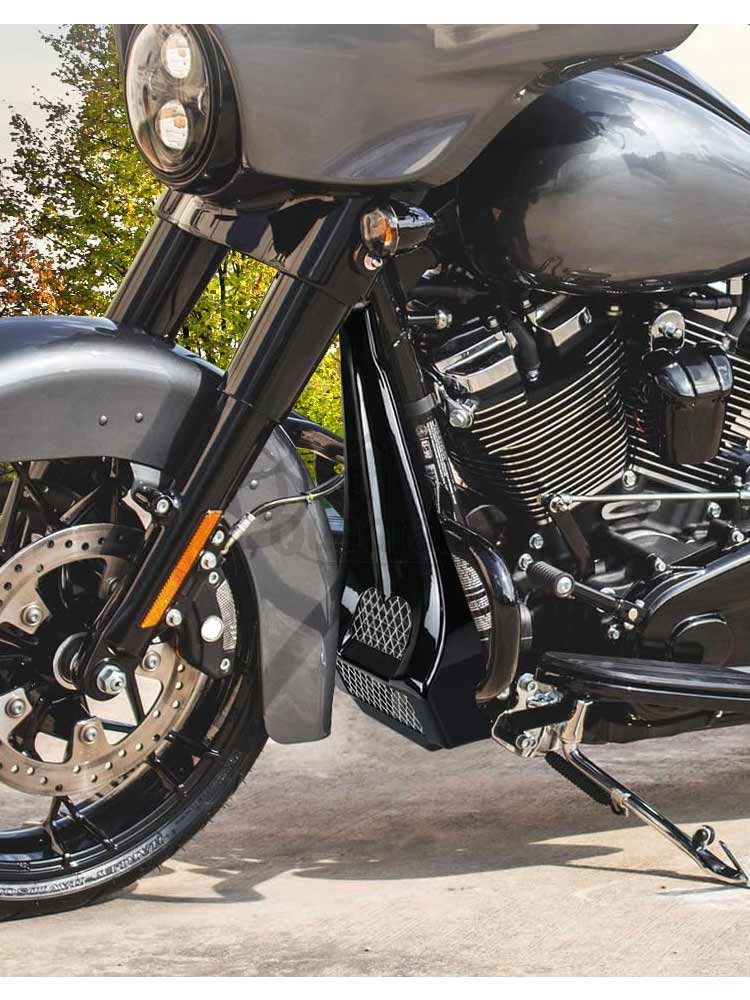 Give your bike's front end an entirely new look with this trick chin spoiler that covers the area between the frame and downtubes, as well as the horn, regulator cover, and oil cooler. The one-piece bolt-on cover installs with ease and features a sculpted and slotted design that maintains all-important airflow to the oil cooler.