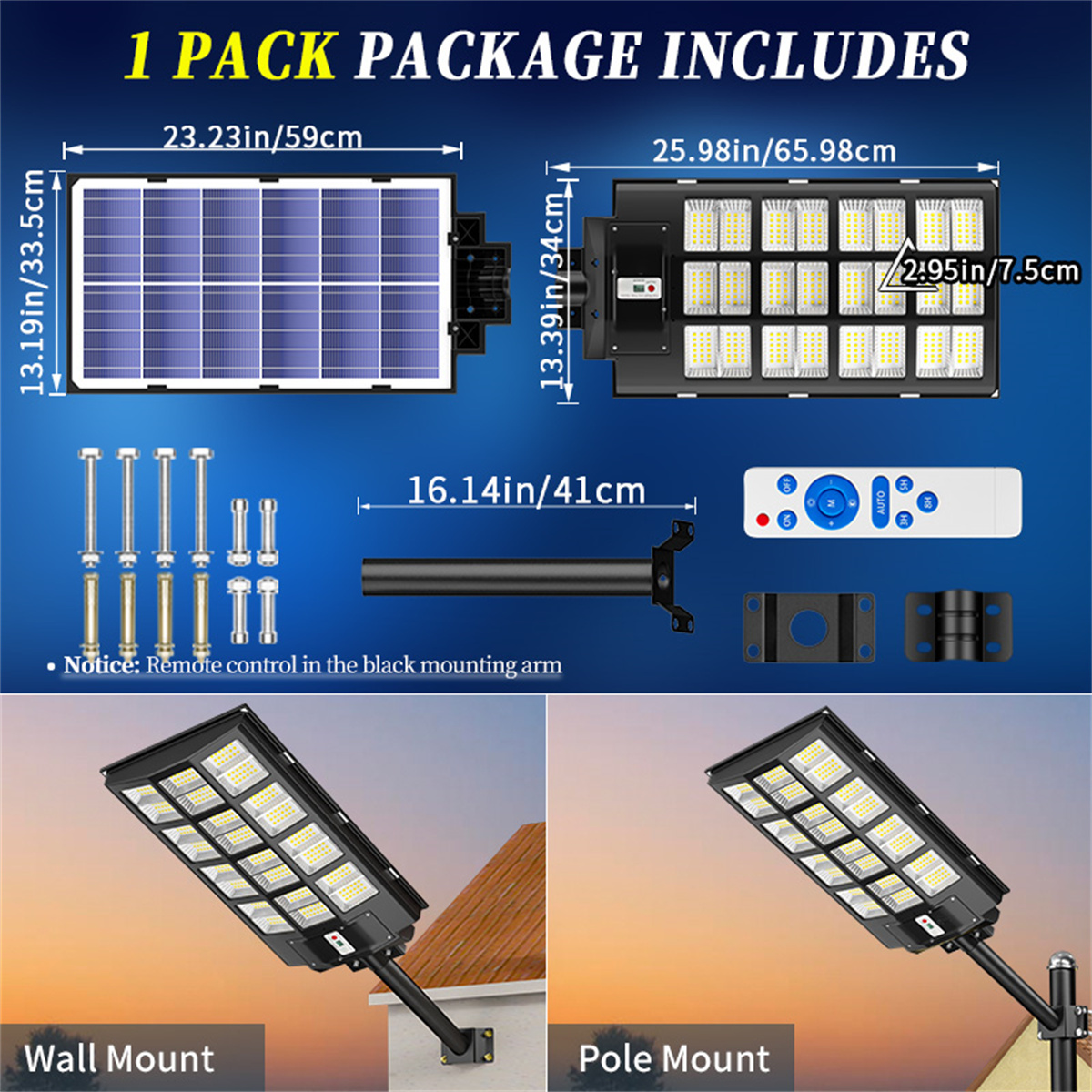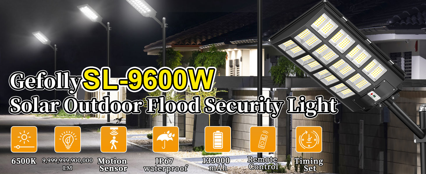 【No Electricity Bills】— Gefolly SL-9600W solar street light provides 6500K daylight white light, equipped with 1260 super bright LED beads and 3.2v-133000mAh battery (lifespan up to 50,000 hours). Our Gefolly super bright beads are 20 times brighter than ordinary beads. IP67 waterproof rating enables it to work properly even in bad weather all year round. Solar powered, no electricity bills, automatically turns on at dusk and turns off during the day. Note: The remote controls that come with the light are available in white and black. The white and black remote controls are shipped randomly.