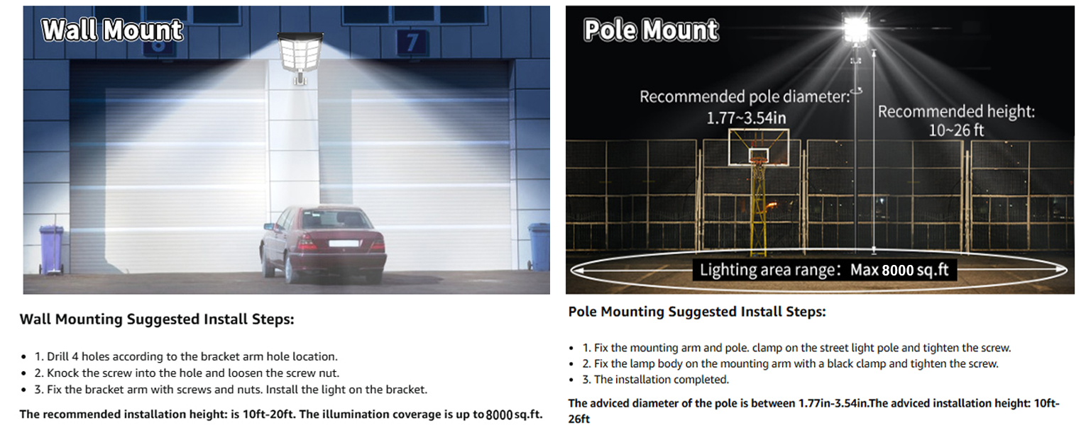 【Easy Installation & Wireless】 — The street lights solar powered comes with a wall and pole mounting accessory kit, no wiring required, and can be easily installed outdoors. Perfect for streets and roads, parking lots, basketball courts, garages, gardens, streets, courtyards, squares, etc. The street light has a built-in 133Ah lithium battery that is more stable and has a longer service life. The working time is up to 20 hours after a full charge of 6-8 hours, and about 40 hours in dim mode.
