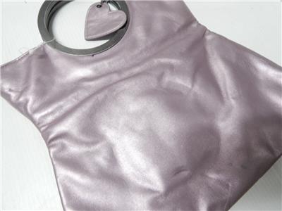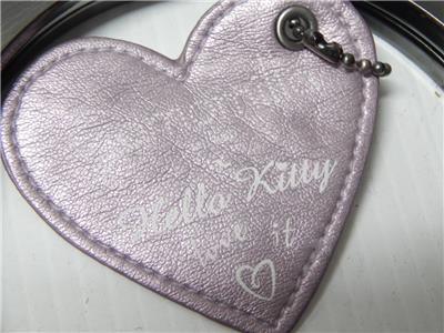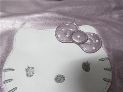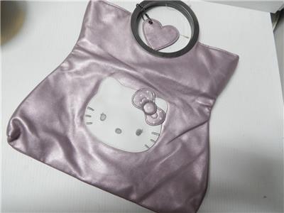 FINE NICE ITALIAN LEATHER FROM MILAN THE FASHION CAPITAL OF EUROPE AND THE WORLD, IN A SOFT ROSE/LAVENDER COLOR WITH A WHITE HELLO KITTY applique on the front with two circular metal handles that are strong and solid and very comfortable to hold. Inside is lined in a metallic and cloth woven material that is also extra fine and nice and includes a deep zippered pocket . Nice quality piece that is HARD TO FIND, a wonderful gift for yourself or a loved one and it has a LOW PRICE and FREE SHIPPING too !