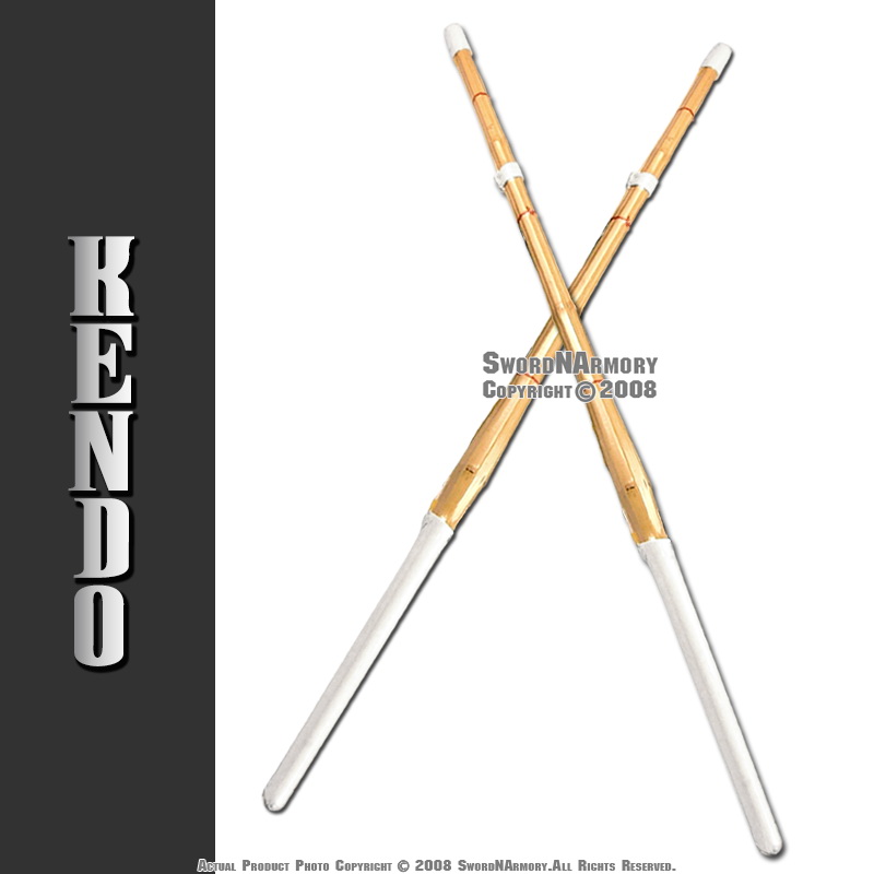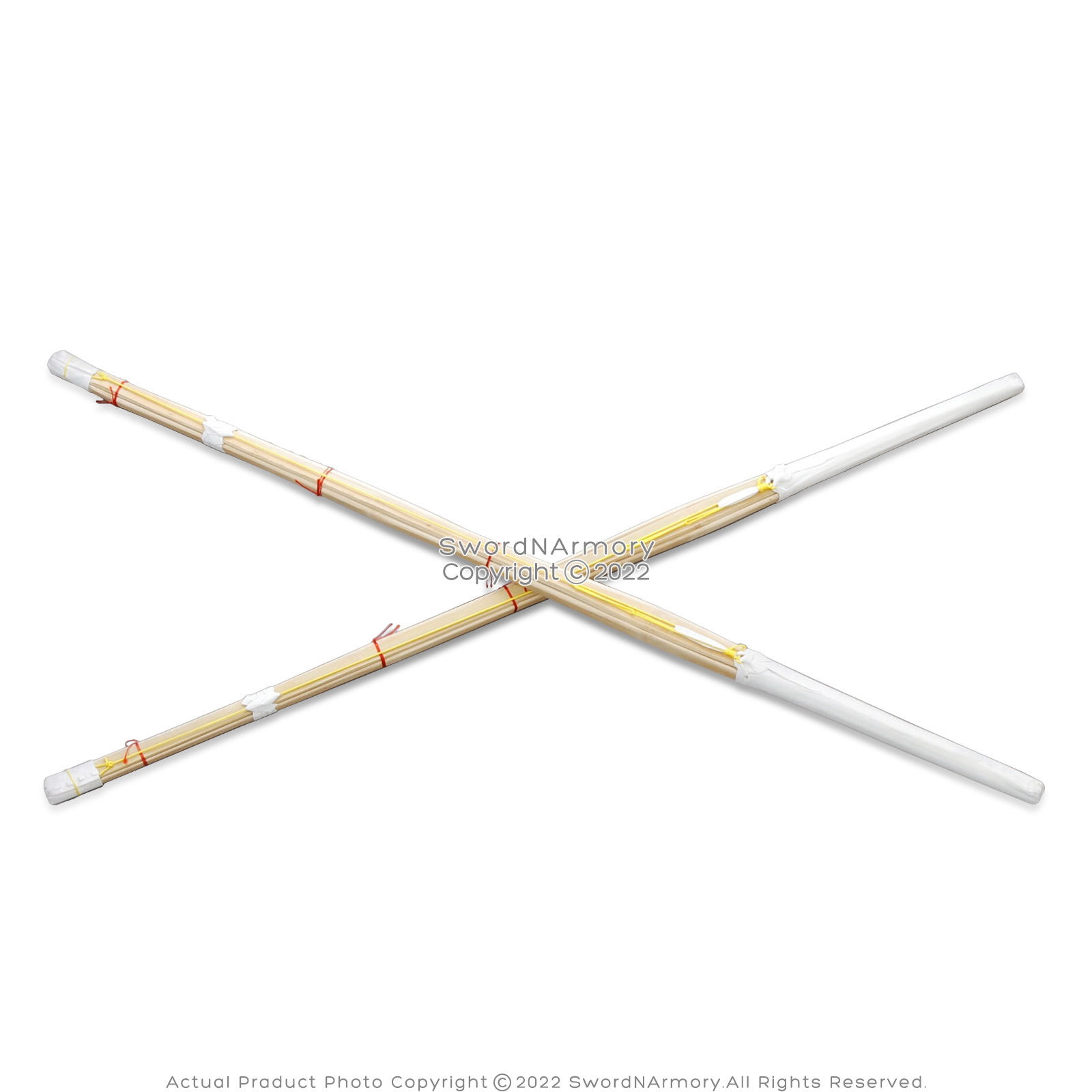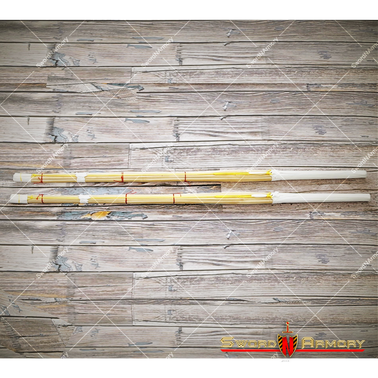 This is a 2 Pc. Set 47"long bamboo shinai. The shinai is used for training in Kendo or a lightweight fighting tool. The shinai is constructed of thick sheaves of bamboo tied together. The handle of the shinai is imitation leather.