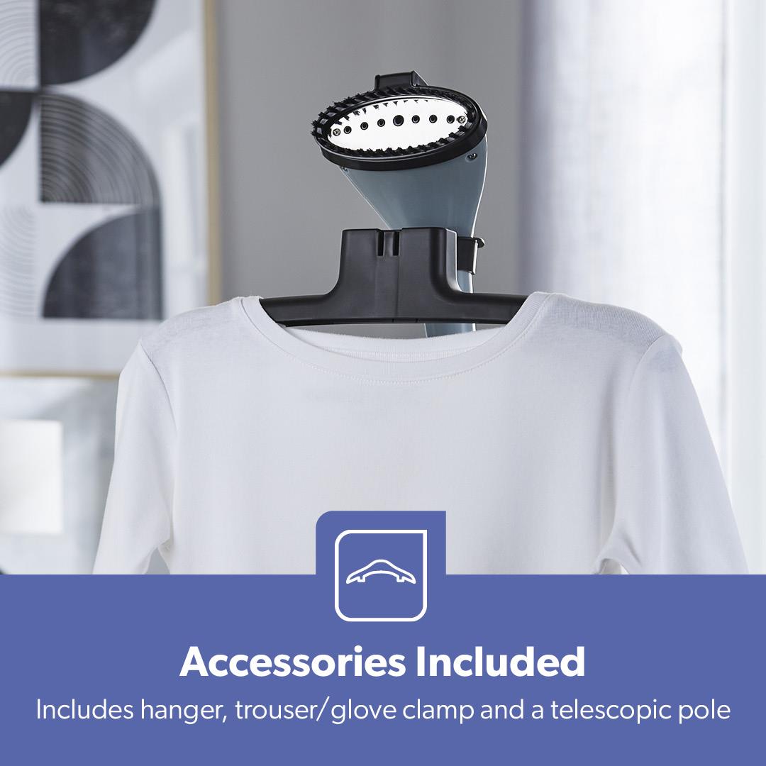 ✅ ACCESSORIES INCLUDED - Accessories include a hanger for convenience and easy wrinkle removal, and a trouser/glove clamp to hold garments in place. A telescopic pole is also included for flexibility and easier control.