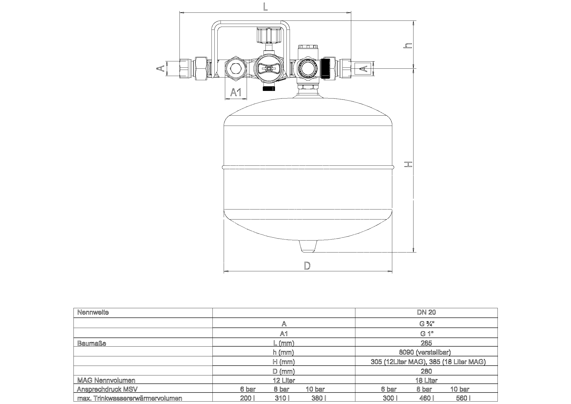 Einbaulage: beliebig, Sicherheitsventil nicht nach unten