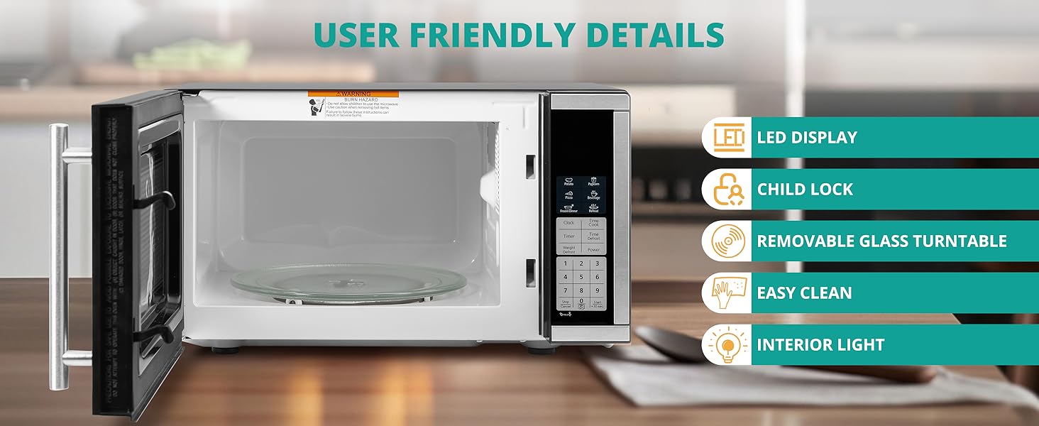 Removable glass turntable for quick cleaning.