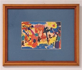 Overall dimensions of the frame are 13" x 10-3/4", the sight size of the frame is 9" x 11-1/4" and the sight size of the mat4-3/4" x 6-1/2". It is signed on back and reads "Pour Nos Amis Louise & John."