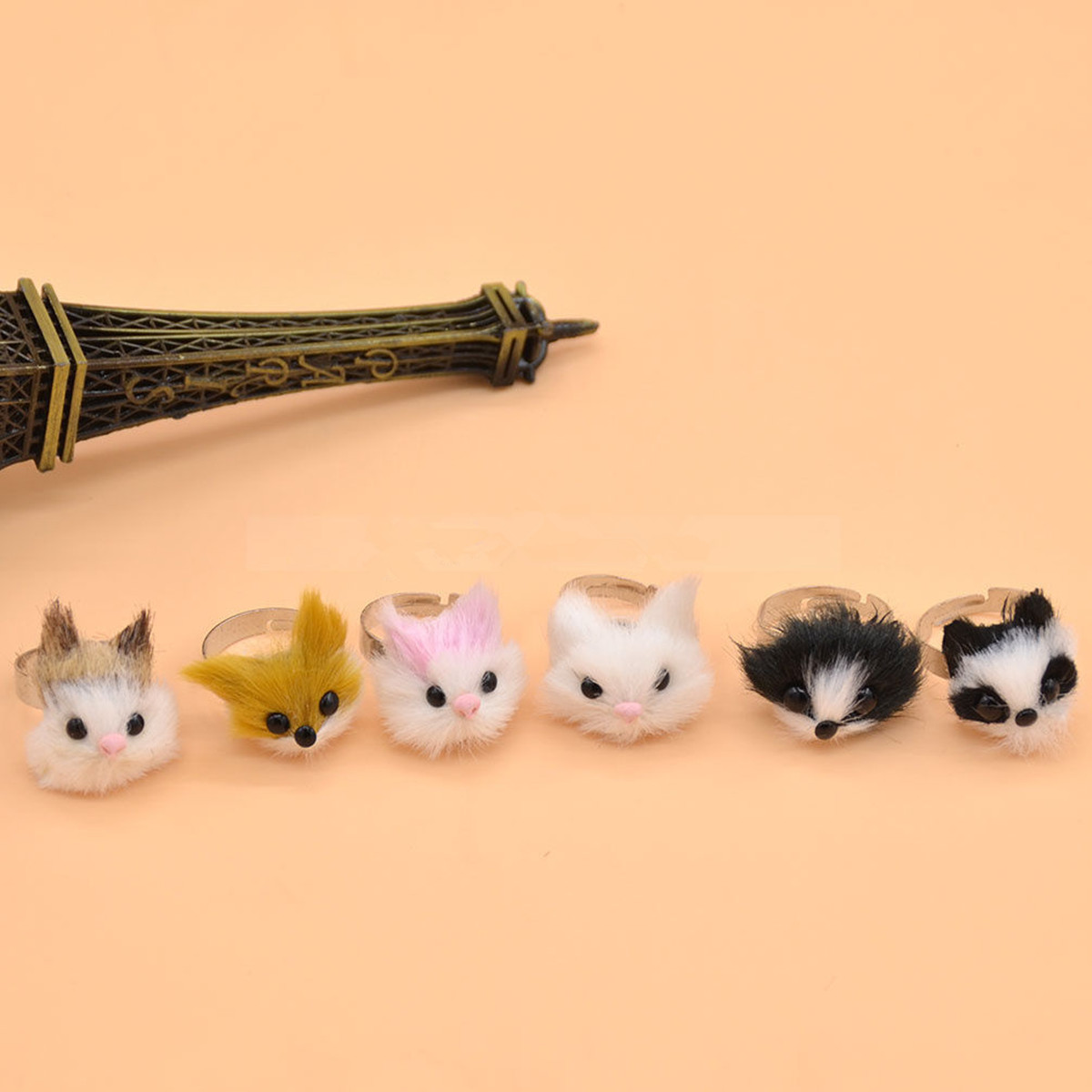 4PCS Faux Furry Animals Head Rings Cat Fox Lovely Finger Ring Adjustable Random