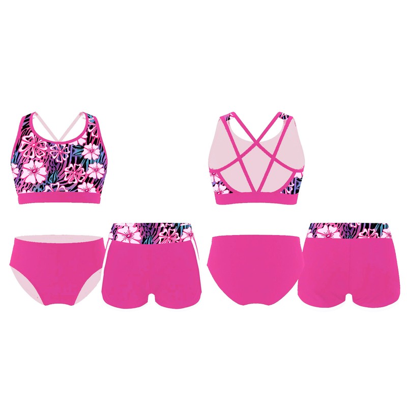 3-teiliges Kinder-Set für Mädchen, U-Ausschnitt, Kreuzträger, offener Rücken, bedrucktes Crop-Top mit Shorts und Slip.