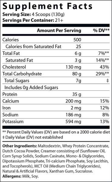 Bulk Mode 6lb Mass Gainer Chocolate Milkshake with Low Sugar contains the perfect scientific ratio of protein (35g) to carbohydrates (80g). Most gainers are loaded with sugar, but Big Mass includes only 7 grams of sugar per serving. Each serving also includes MCT oil which is uséd as a direct energy source.