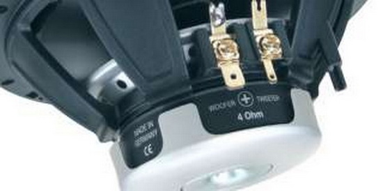 For this purpose, the phase plug in the middle of the bass/midrange driver can be removed and replaced with a tweeter (included in delivery). The tweeter can be snapped onto this mount. The additional tweeter connections are located on the basket of the bass/midrange driver.