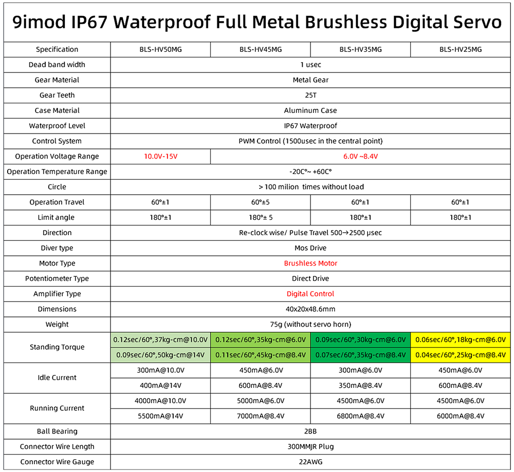 Dead band width:1 usecOperation Voltage Range:6.0V ~8.4V (50kg Servo operate voltage is 10.0V ~15V .)
