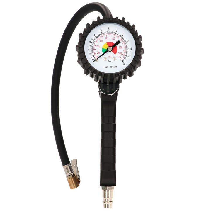Ausgestattet mit einem großen, präzisen Manometer mit BAR- und PSI-Skala, das zum Schutz vor Beschädigungen mit Gummi ummantelt ist.