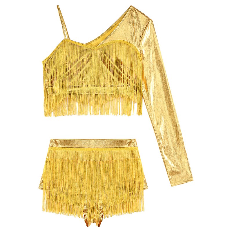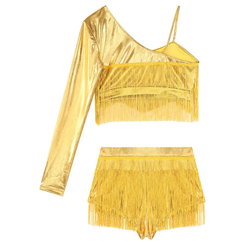 This dance outfit is adorned with tassels, metallic appearance set, adds a touch of glamour.