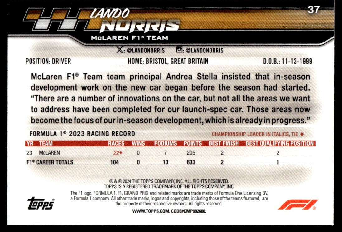| LANDO NORRIS 2024 Topps Paddock Pass Formula 1 F1 Car Card #37 McLaren |