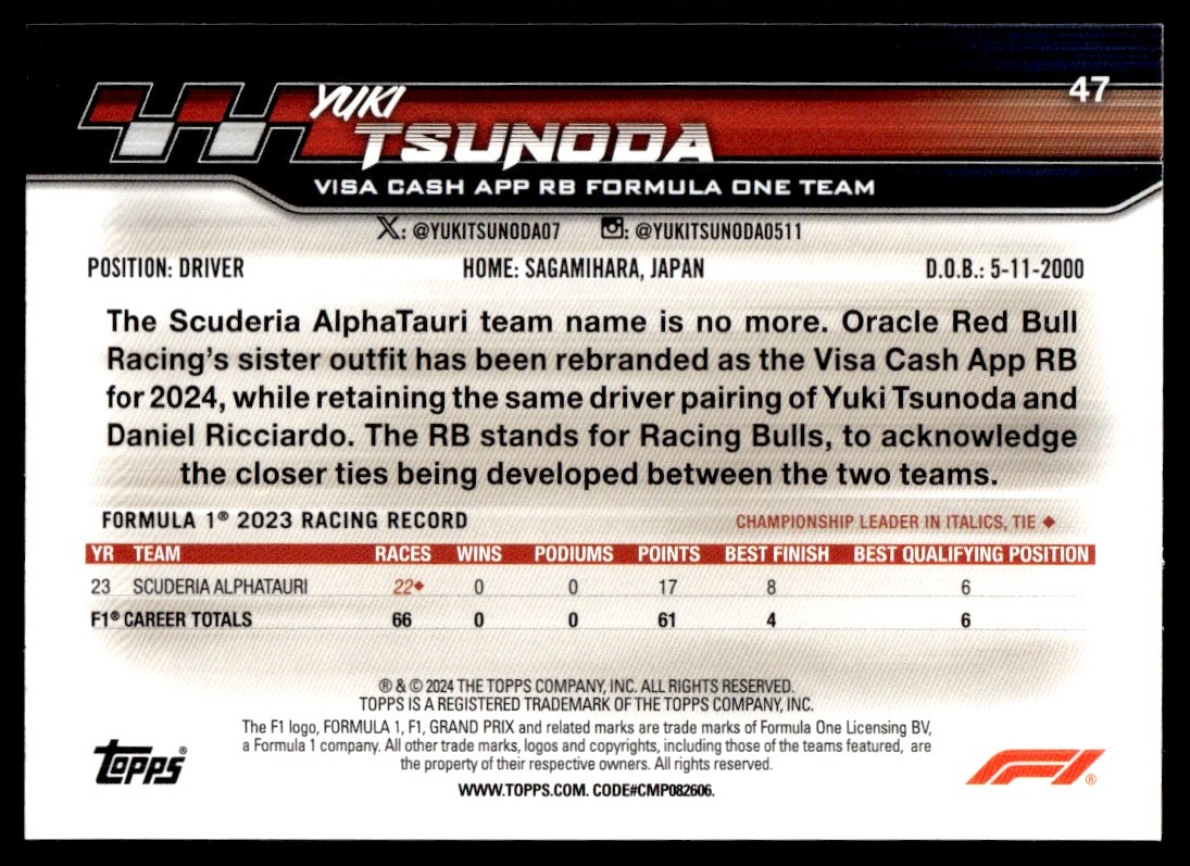 | YUKI TSUNODA 2024 Topps Paddock Pass Formula 1 F1 Car Card #47 Visa Cash App |