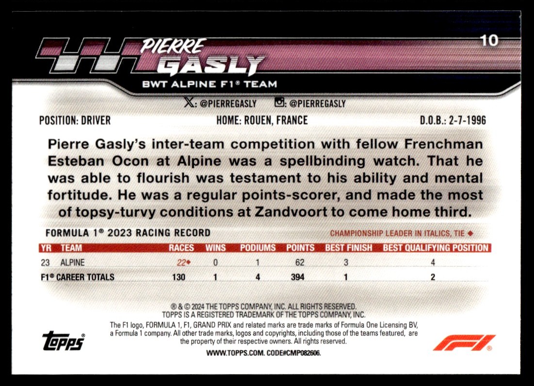 | PIERRE GASLY 2024 Topps Paddock Pass Formula 1 F1 Card Photo Variation #10 |