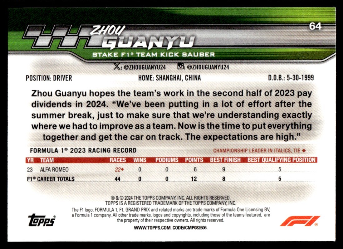 | ZHOU GUANYU 2024 Topps Paddock Pass Formula 1 F1 Card #64 Stake |