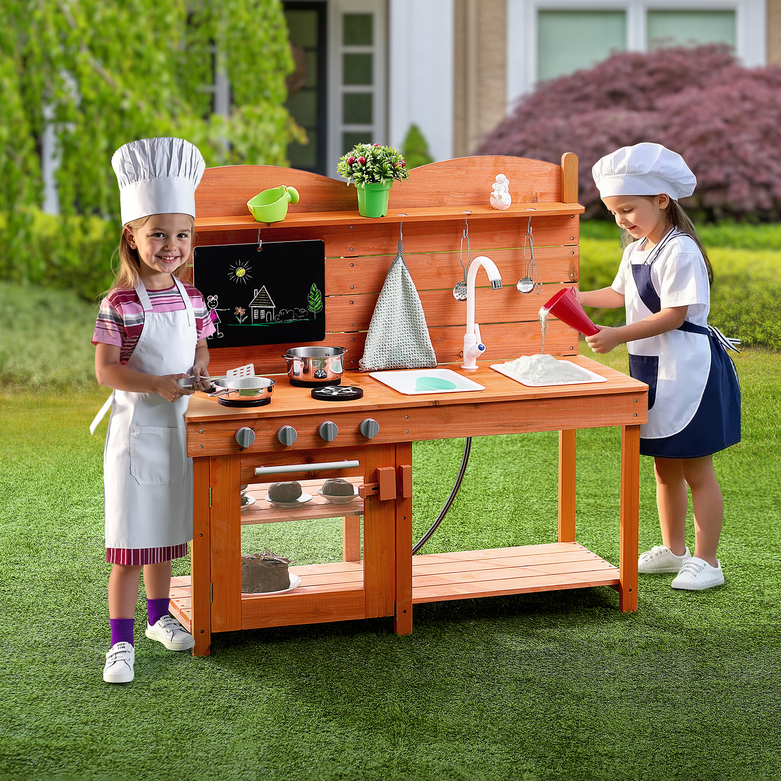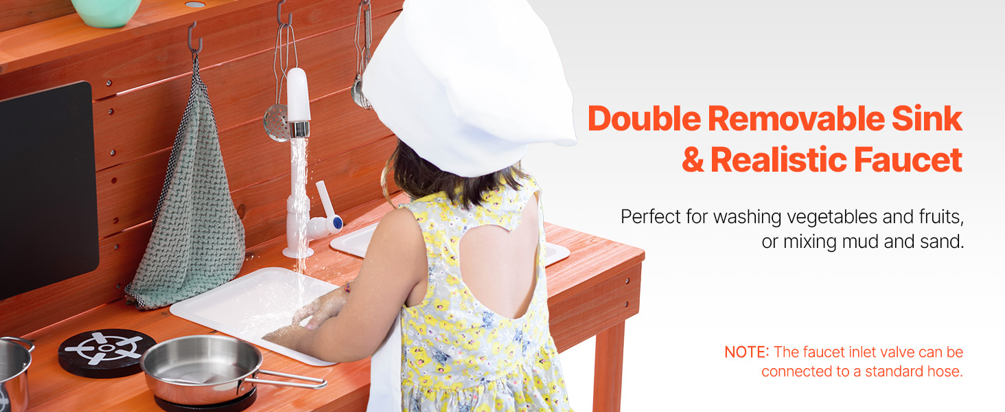 - Realistic Kitchen Play Design: Let your little one imitate cooking with dirt just like a real chef! Little chefs can write and draw menus on the magnetic chalkboard, use the two removable sinks and pull-out faucet to clean up their "dishes" (the faucet is compatible with a standard garden hose), and turn the knobs on the simulated stove to start cooking. They can even bake "mud pies" in the dual-layer oven! After play, they can easily clean the surface with the pull-out faucet