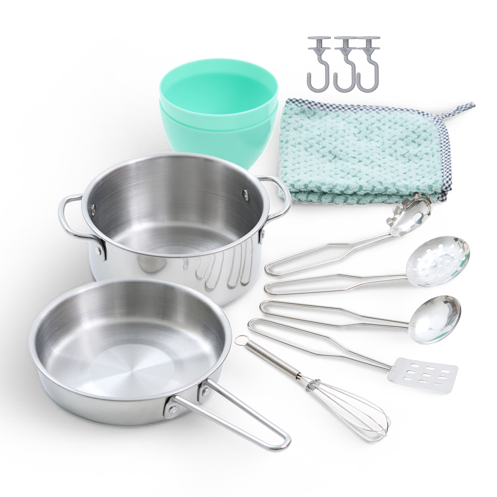 - Rich Accessories: This wooden toy playset comes with 13 kitchen accessories, so there's no need to purchase additional play props. The set includes: 1 soup pot (without lid), 1 frying pan (without lid), 2 bowls, 4 spoons, 1 dishcloth, 3 hooks, and 1 whisk. The multiple storage shelves help kids learn to organize and arrange items independently, fostering autonomy and allowing them to immerse themselves in creative and interactive play while staying away from screens
