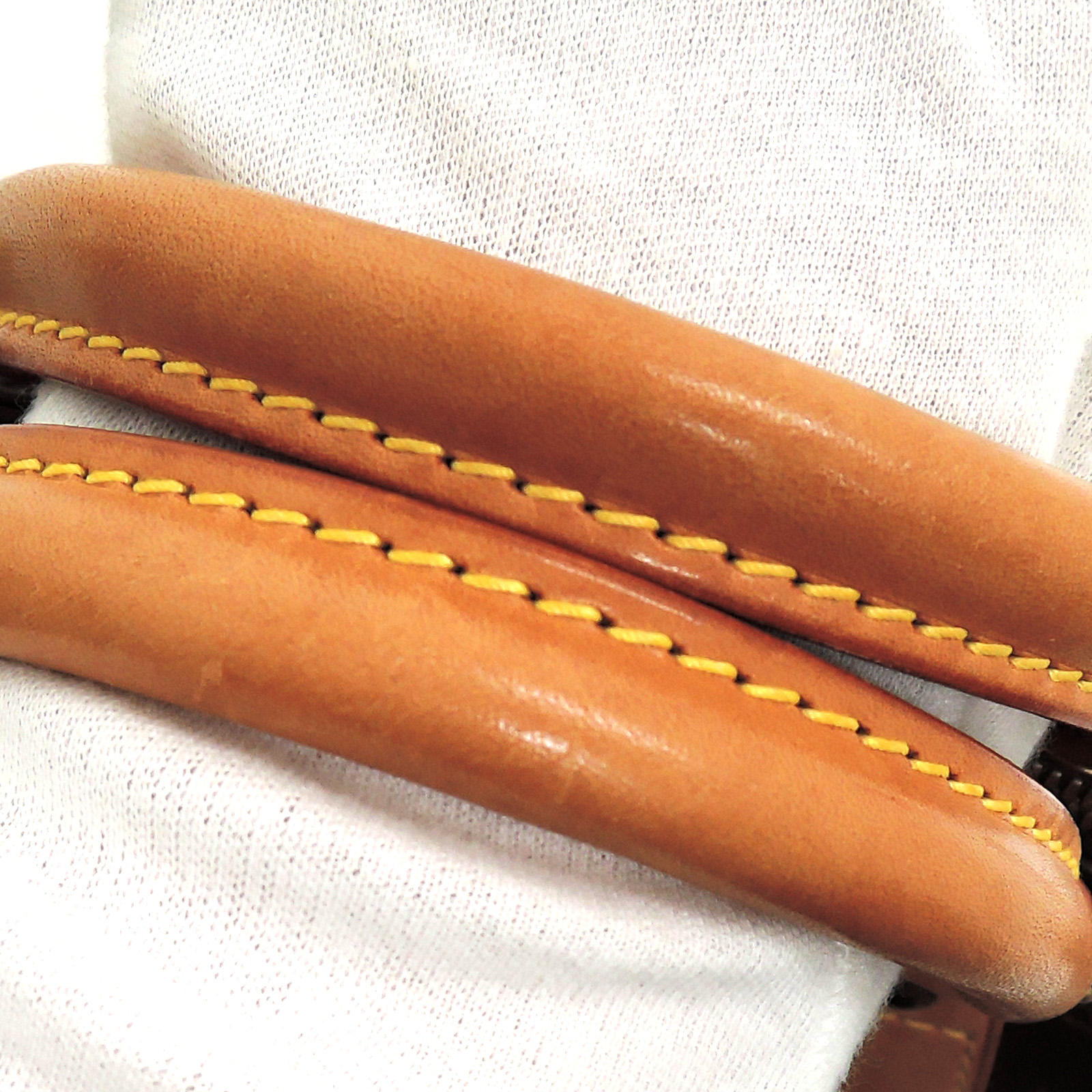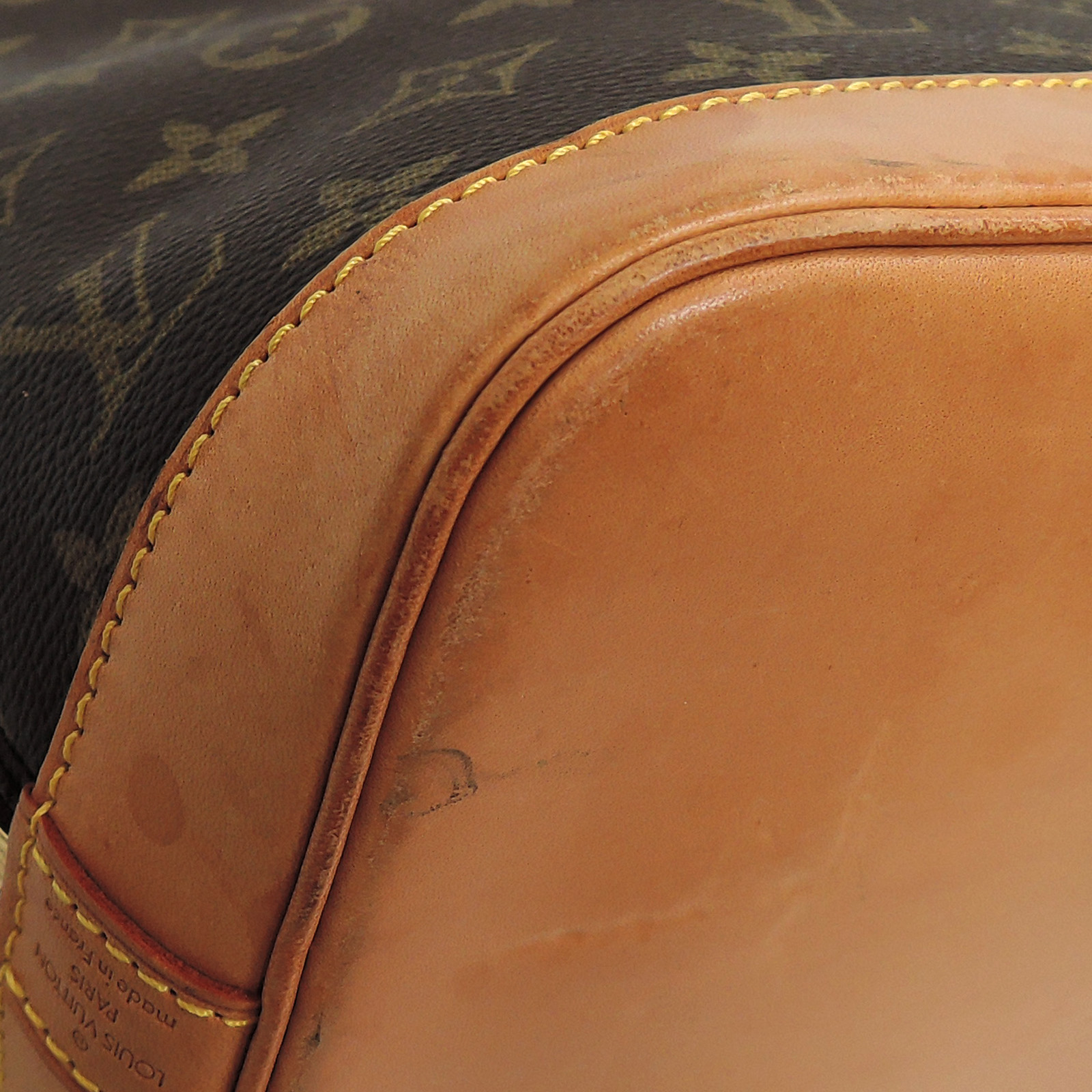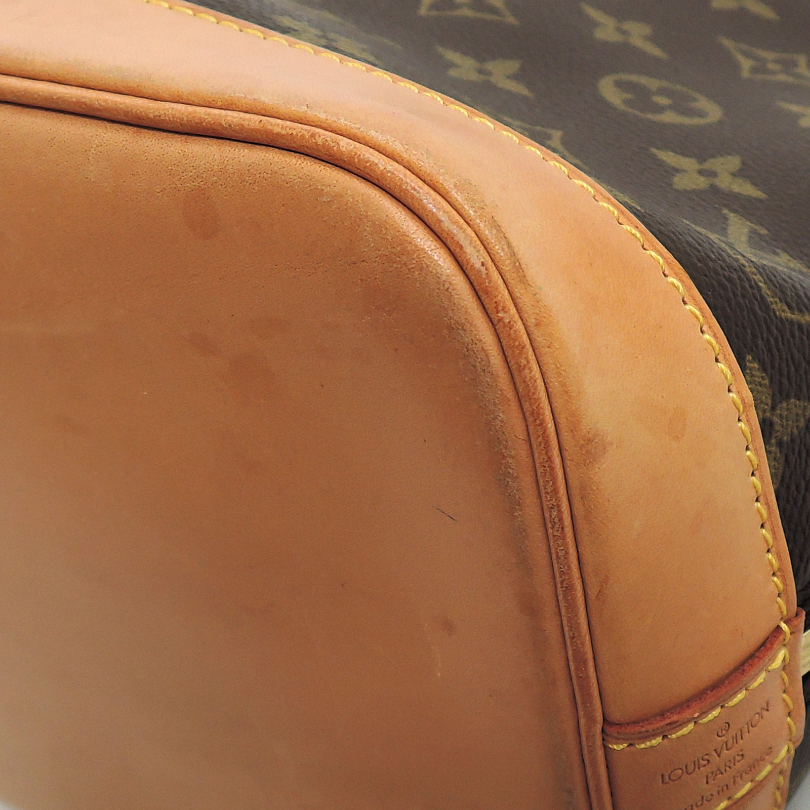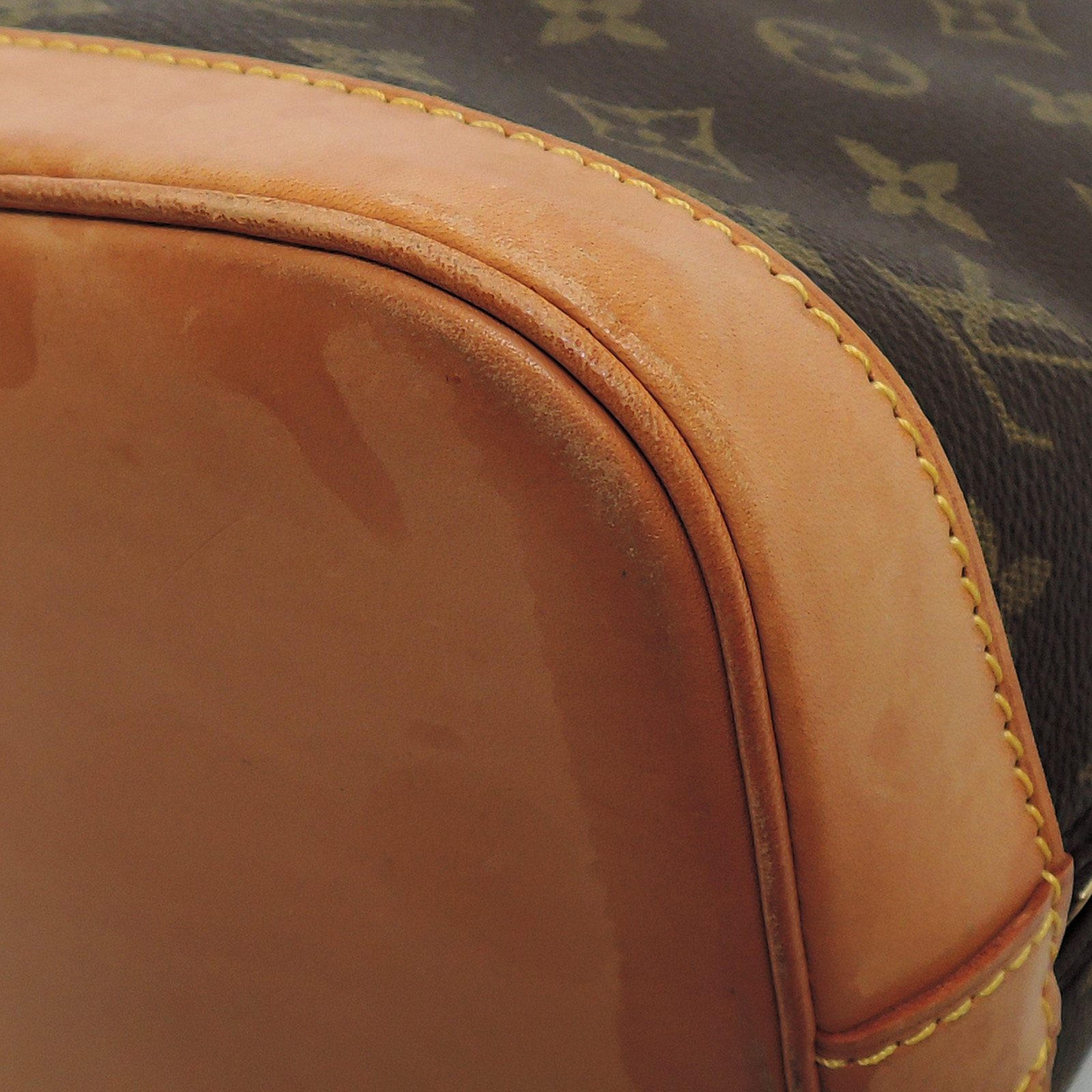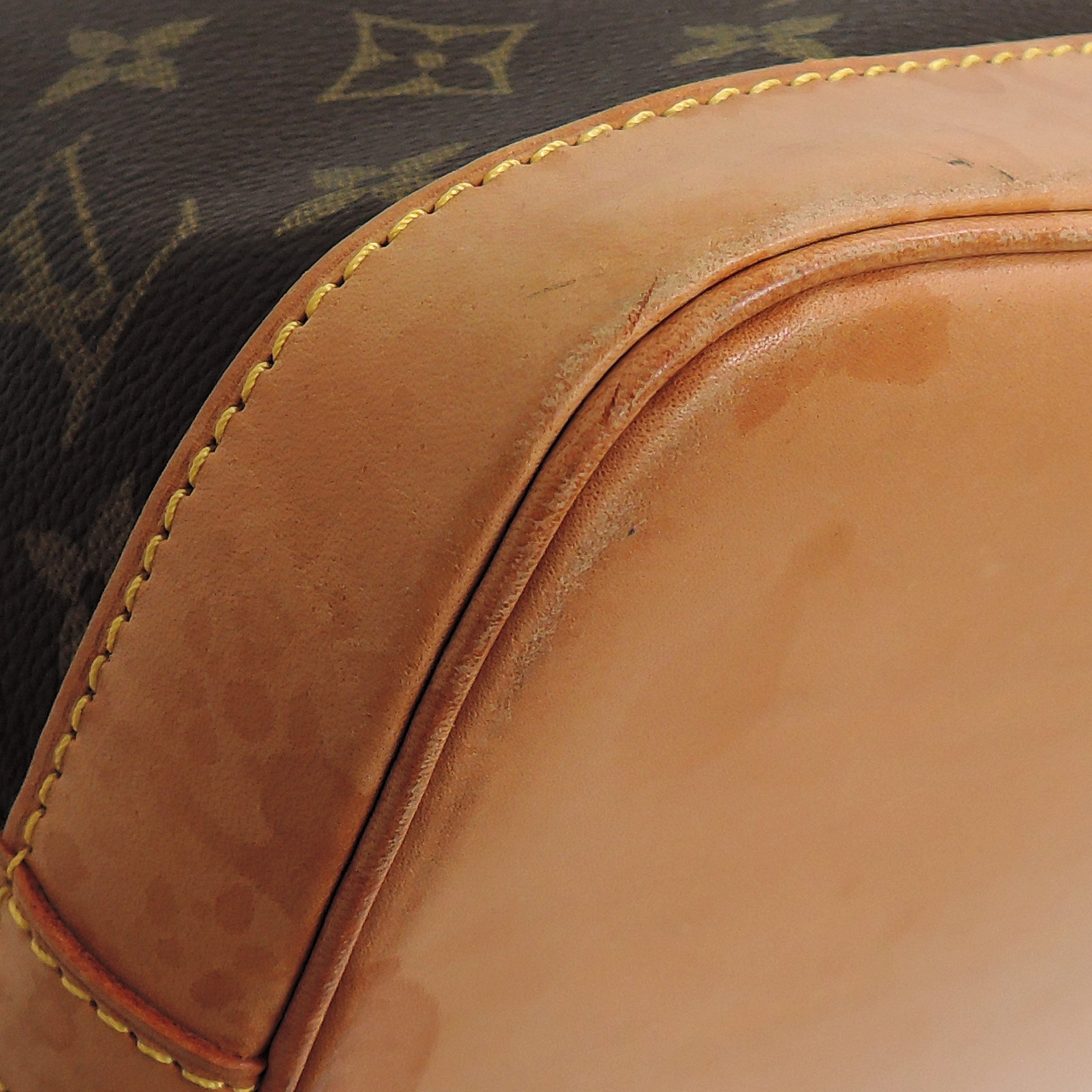 Supplement : The used bag is in good condition. There is no major problem on the inside liner. The light brown leather area has water spots. The handles have a noticeable used appearance. The corners of the bag are worn out due to usage. Please check the details in the pictures.