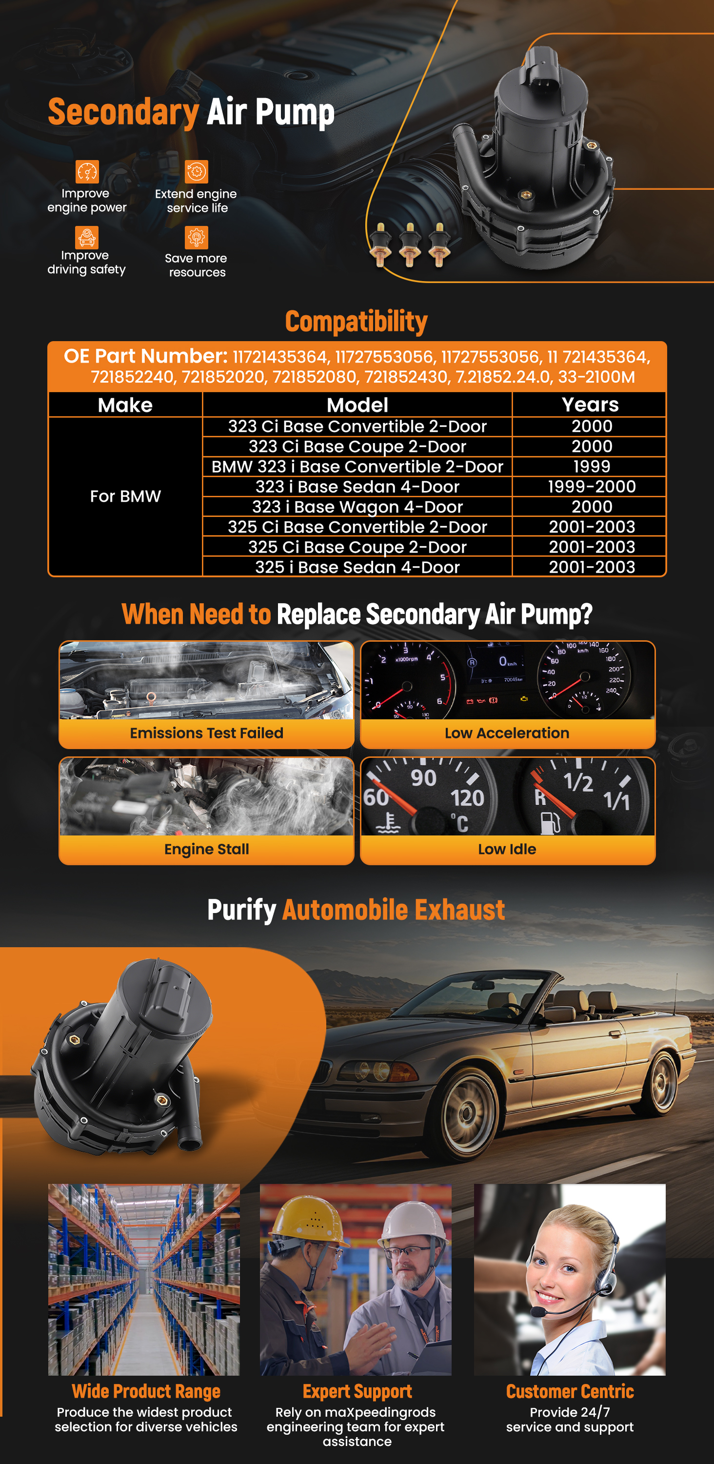 4.Improved Fuel Economy:By ensuring efficient fuel combustion, secondary air pump can contribute to better mileage. help reduce harmful exhaust emissions by effectively injecting fresh air into the exhaust system.