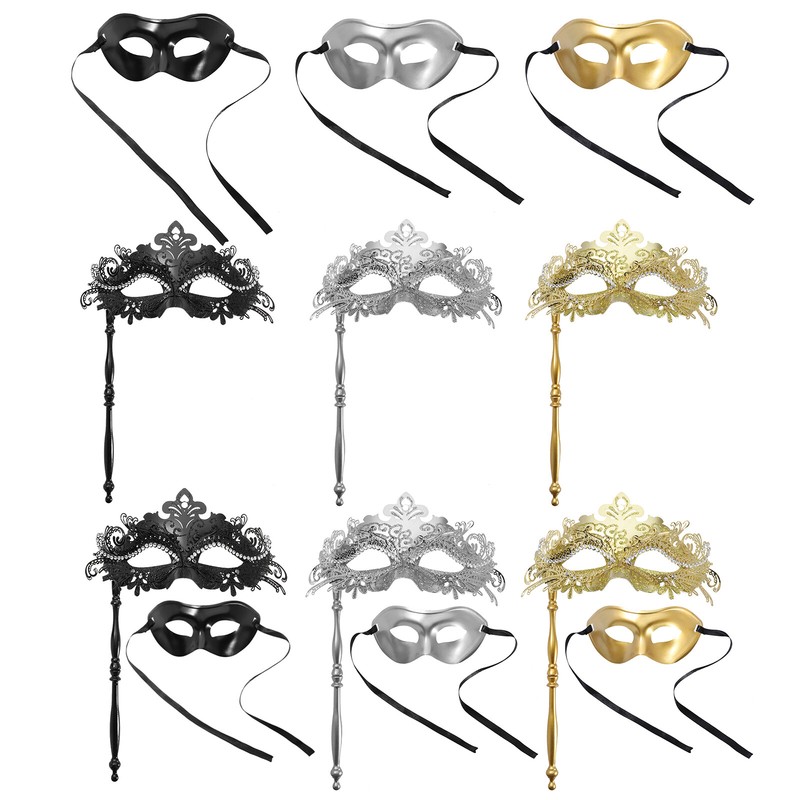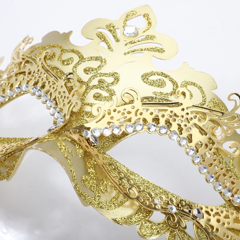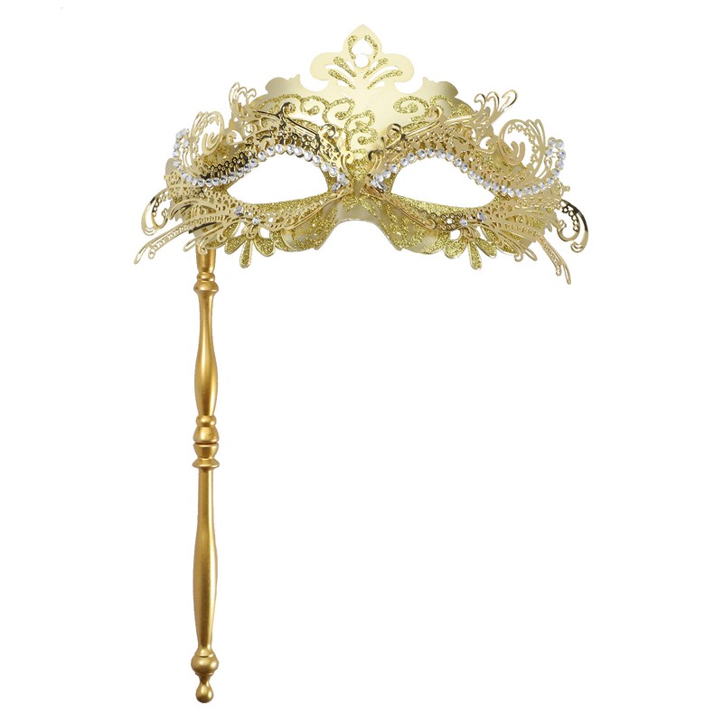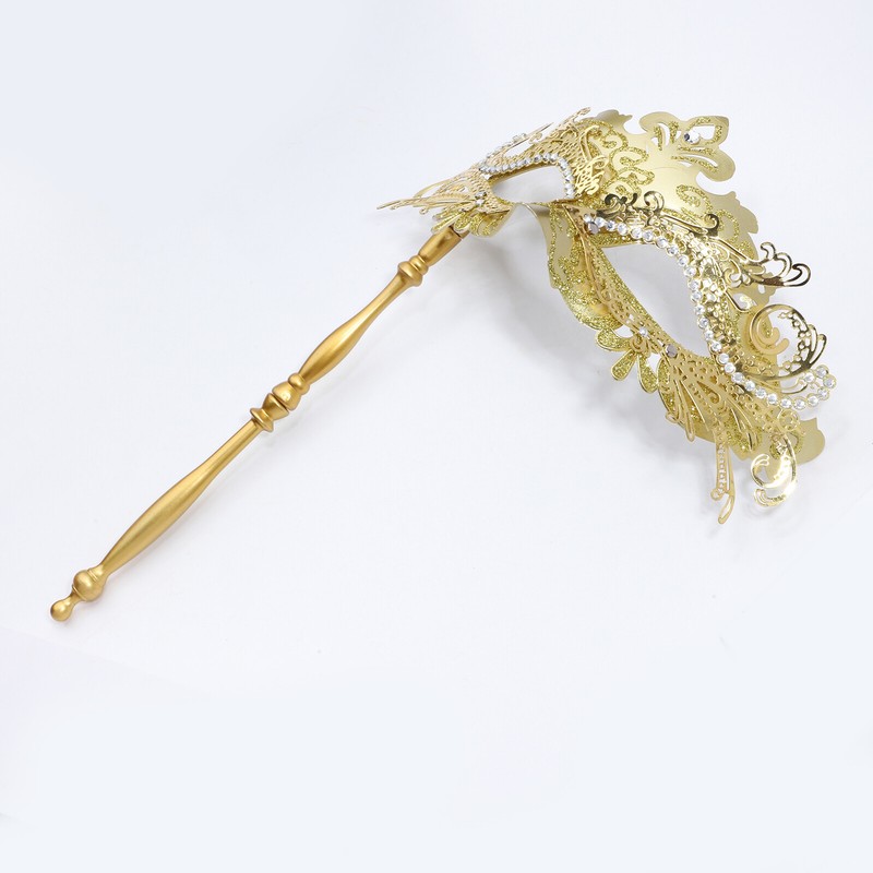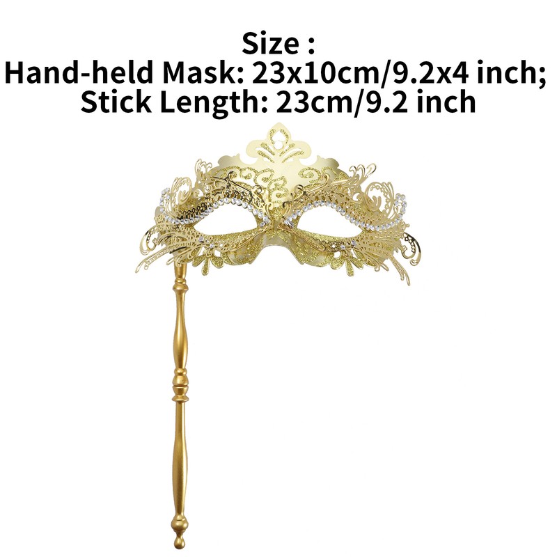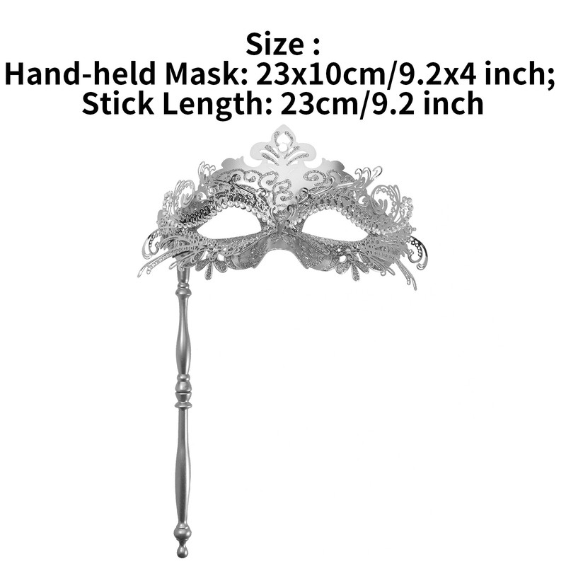 Hand-held metal mask decorates with shiny rhinestone and exquisite hollowing pattern; holding stick is easy to assemble.