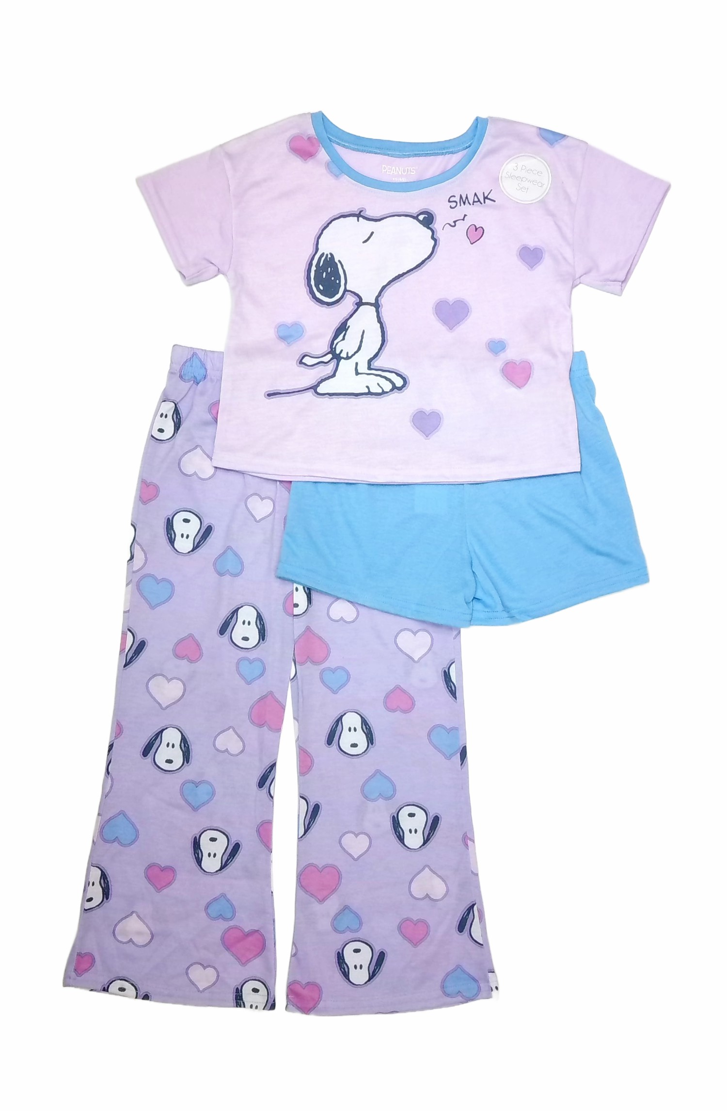 The pajama top showcases Snoopy in an adorable "blowing kisses" theme surrounded by hearts, all set against a lilac purple background. It has short sleeves and a roomy crew-neck collar in sky blue.