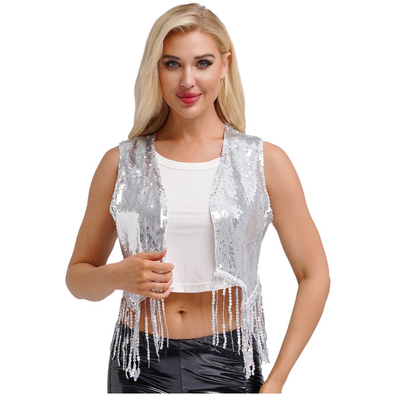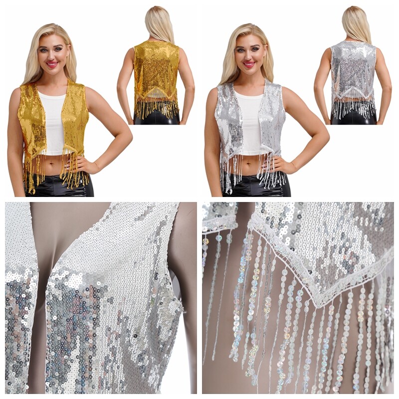 Designed with open front, sleeveless, jagged trims, sequined fringe, fully lining and crop length, the vest makes women very stunning.