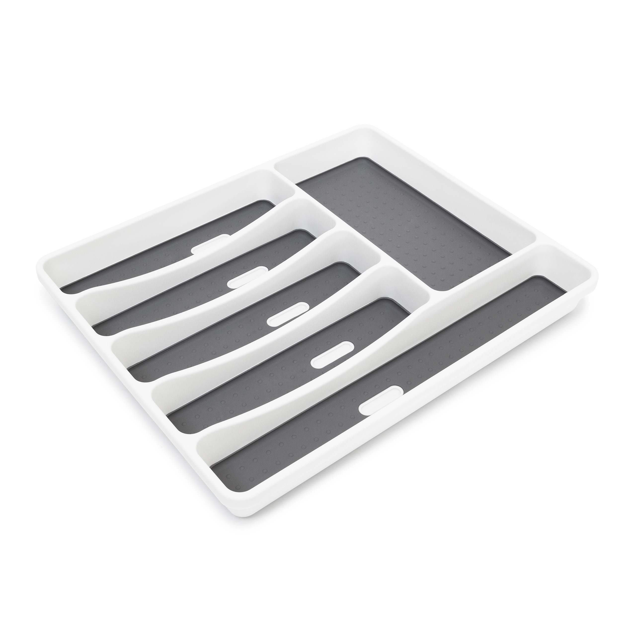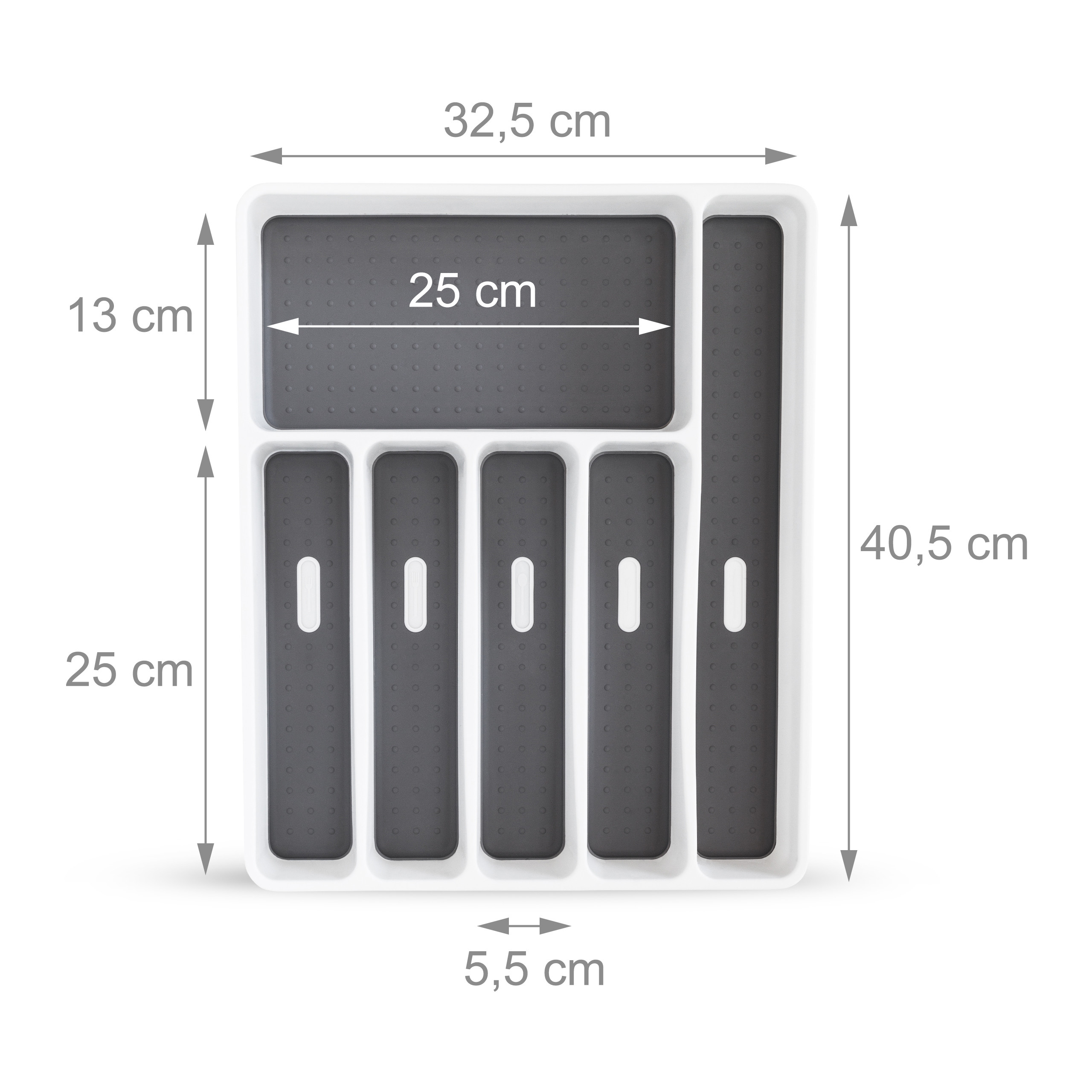Mit diesem Besteckkasten aus Kunststoff schaffen Sie Ordnung in Ihrer Küche. Mit seiner Höhe von rund 5 cm passt der Besteckeinsatz in nahezu jedes Schubfach. Der Besteckkasten verfügt über 6 verschieden große Fächer mit gummierten Böden in Grau, die sich leicht reinigen lassen. Auch für die Spülmaschine ist die Schubladeneinlage geeignet. Der robuste Schubladeneinsatz verfügt an der Unterseite über 5 Füße aus rutschhemmendem Gummi, die die Besteckbox stabil im Schubfach halten.