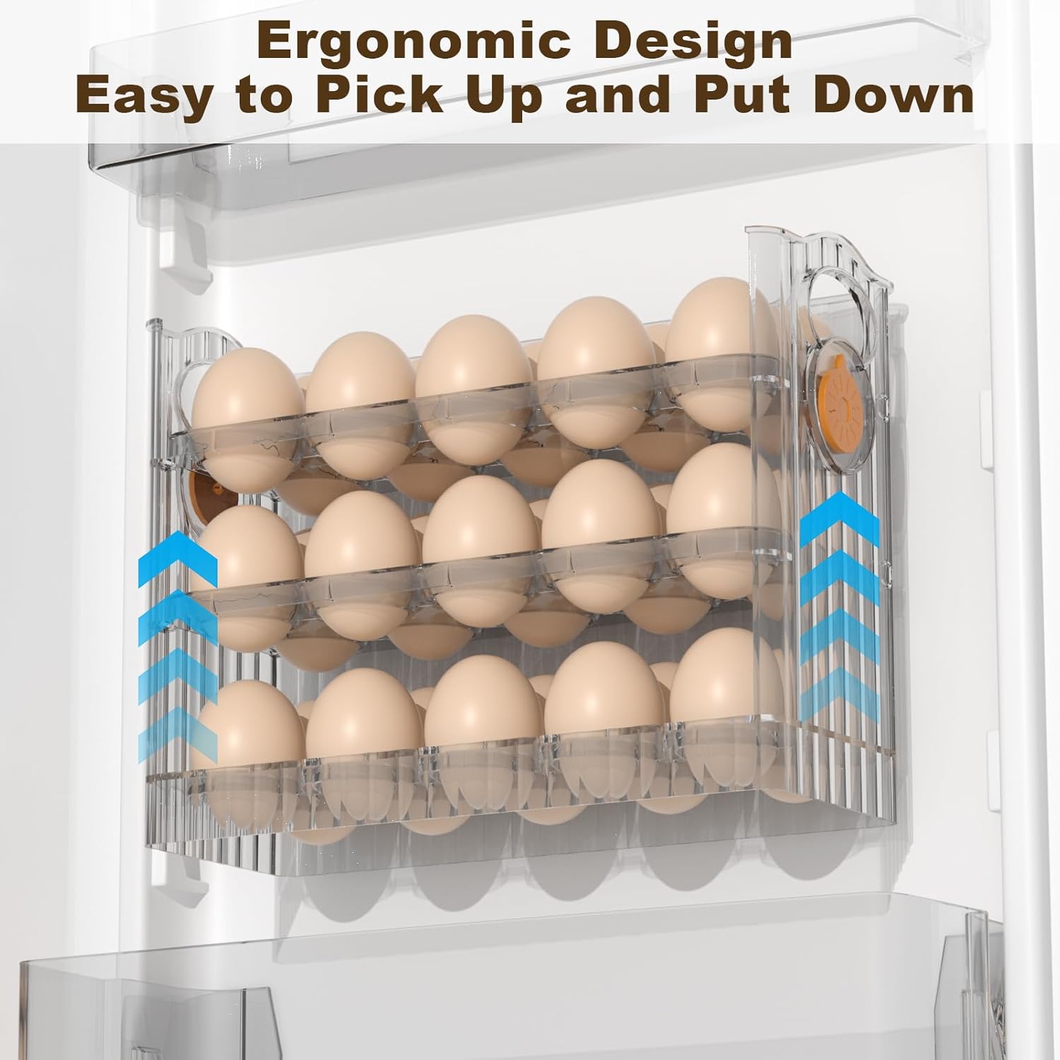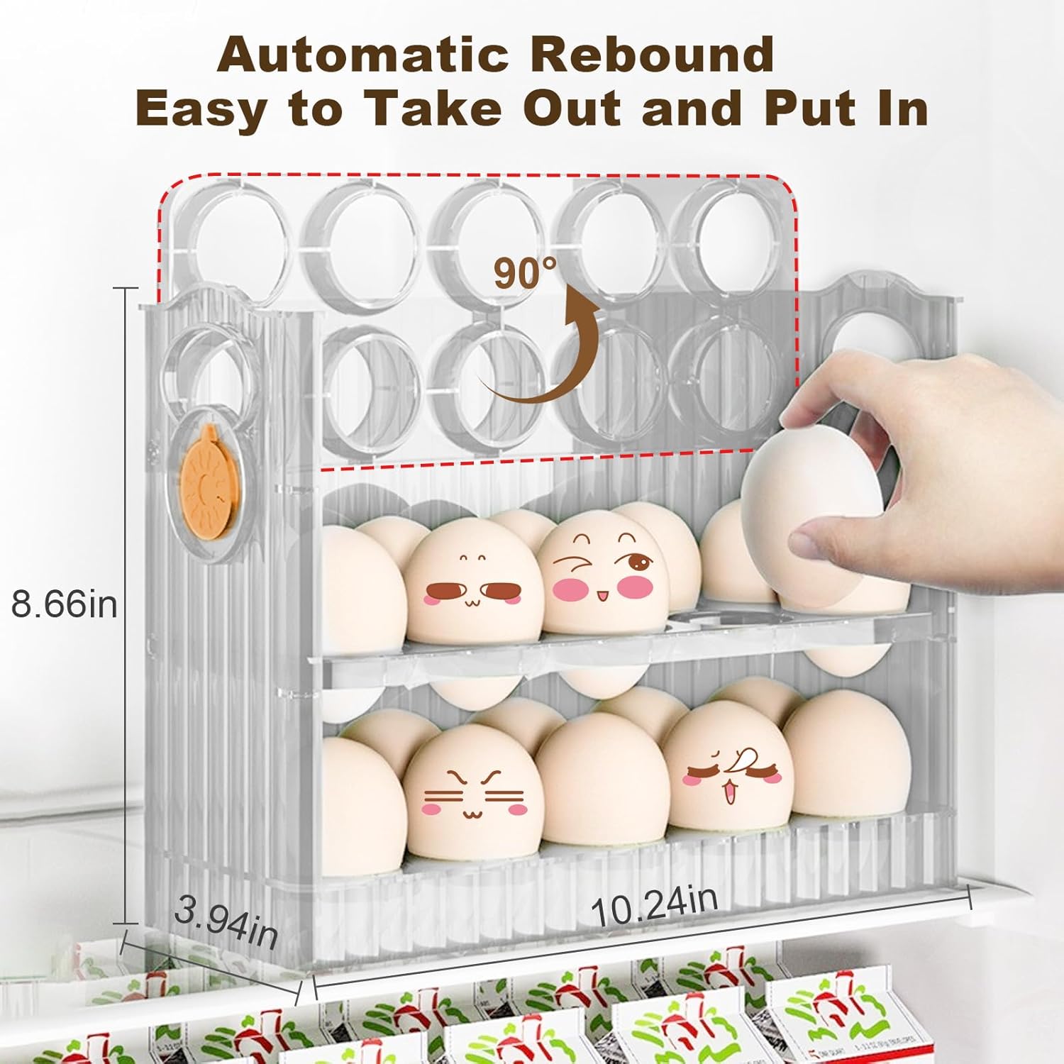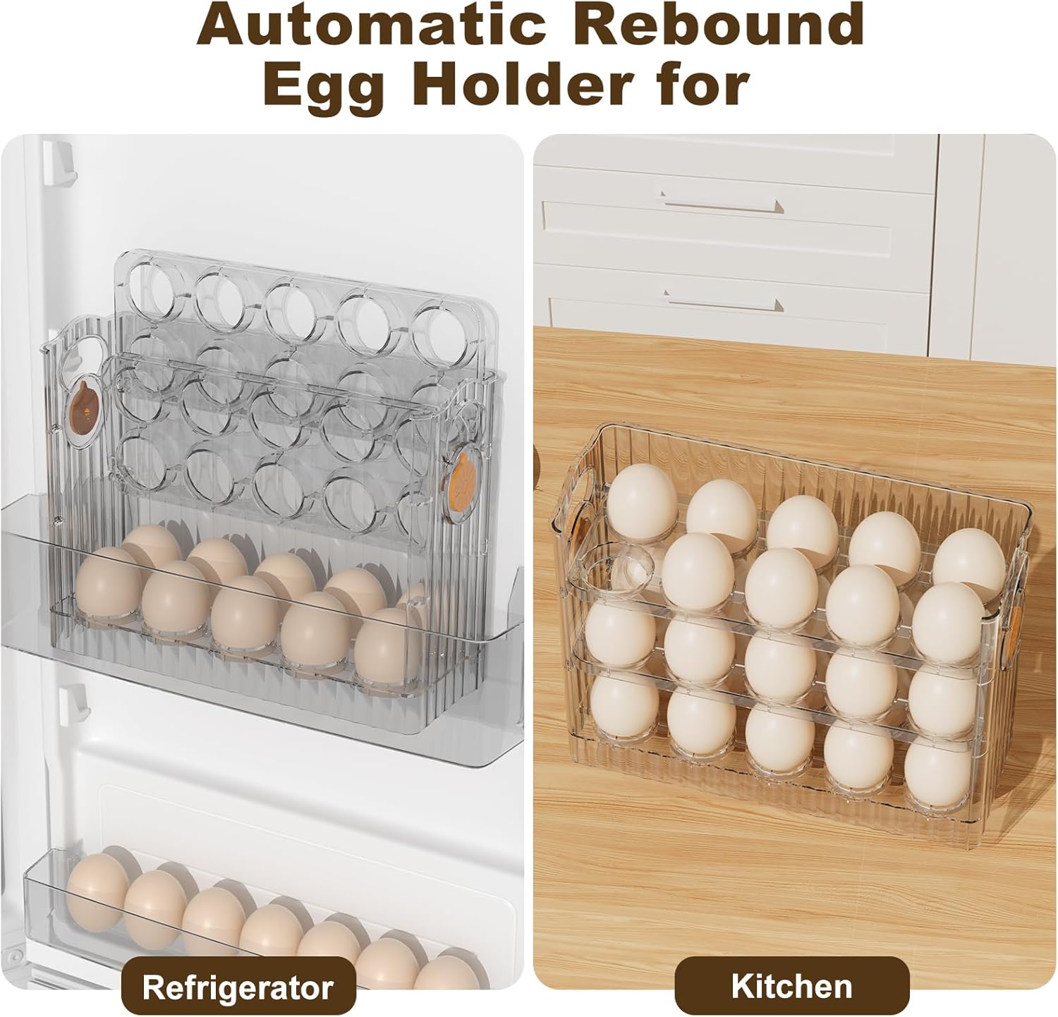 【Automatic Rebound】 Our new egg holder for fridge features an automatic rebound design, eggs are easy to take out and put in. When you remove each layer of eggs, the egg dispenser will automatically rebound, no need to operate by hand, very convenient to use.