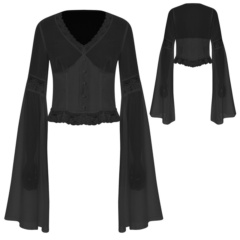 Designed with v neck, ultra long sleeve with bell bottom, floral lace trim and button decorations, solid color and cropped length.