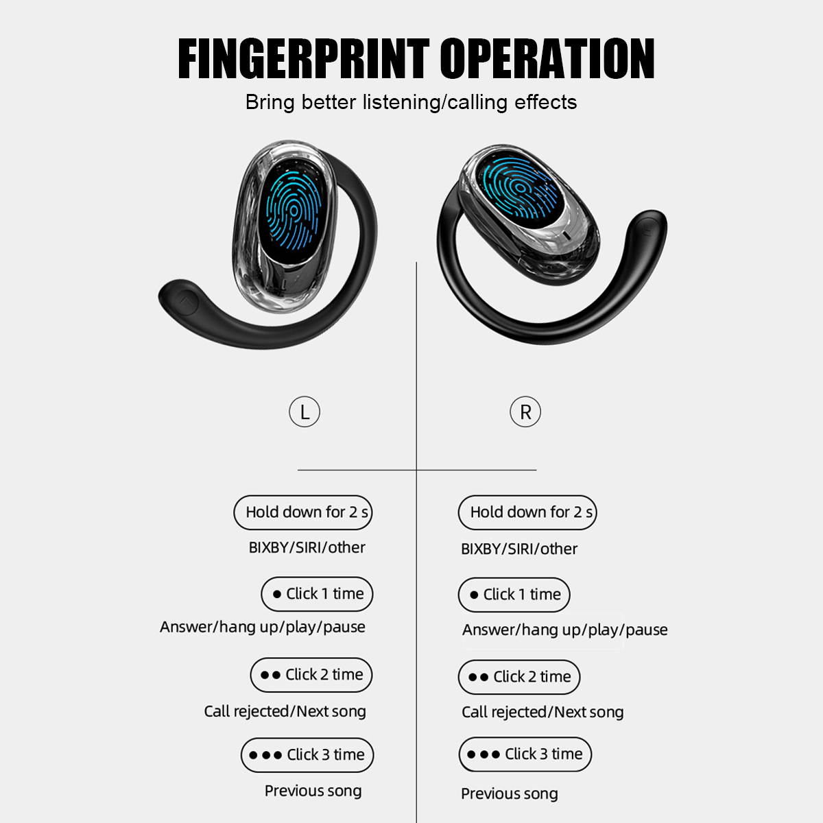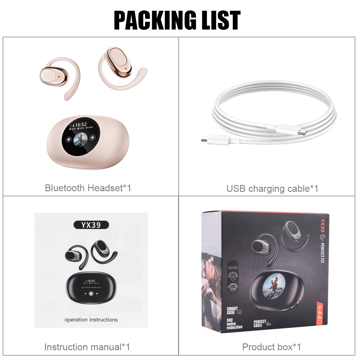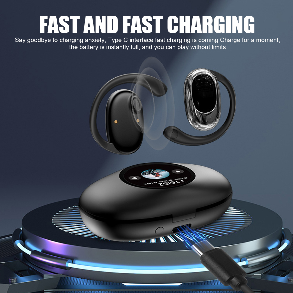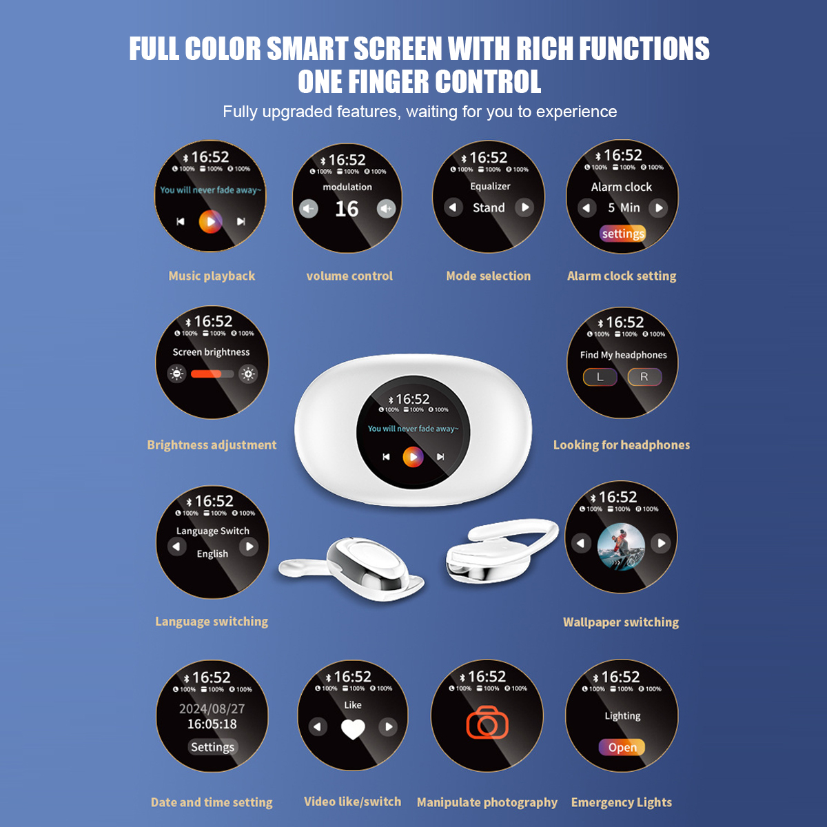 Functions: music playback, volume adjustment, mode selection, alarm clock settings, brightness adjustment, find headphones, language switch, wallpaper switch, date and time settings, screen tap/switch, control the photo, emergency lighting
