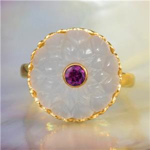 Vermeil de oro de 18k sobre el sólido 925 Ring de plata esterlina con una gran calcedonía blanca translúcida tallada y redonda Flor de loto con una incrustación de piedras precipitadas de Rhodolite de bisel.